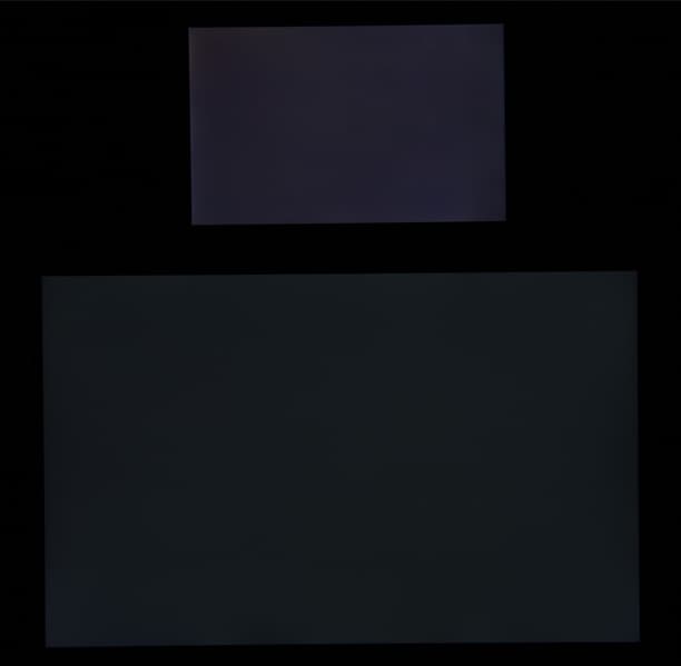 Яркость под этим углом у обоих экранов заметно уменьшилась (выдержка увеличена в 5 раз), но экран MacBook Pro все же немного светлее. Черное поле при отклонении по диагонали высветляется слабо и приобретает легкий красно-фиолетовый оттенок. Фотография ниже это демонстрирует (яркость белых участков в перпендикулярном плоскости экранов направлении примерно одинаковая!):