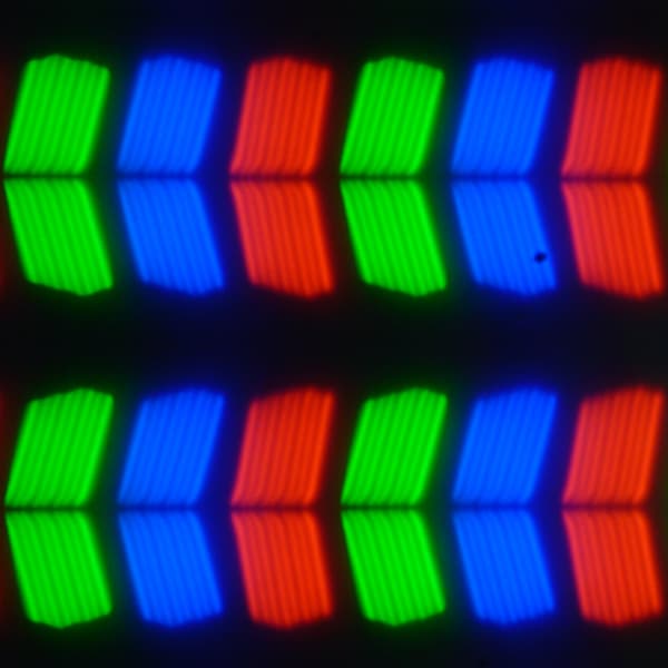 В данном MacBook Pro используется матрица типа IPS. Микрофотографии демонстрируют типичную для IPS структуру субпикселей: