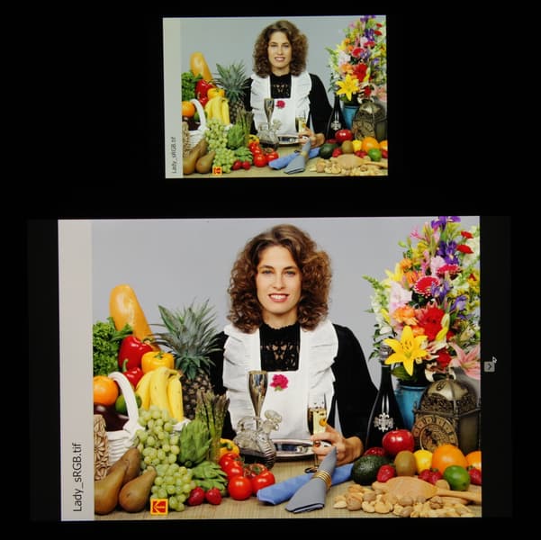 Заметим, что такие спектры встречаются в мобильных и не очень мобильных устройствах Apple и других производителей. По всей видимости, в подобных экранах используются светодиоды с синим излучателем и зеленым и красным люминофором (обычно — синий излучатель и желтый люминофор), что в сочетании со специальными светофильтрами матрицы и позволяет получить широкий цветовой охват. Да, и в красном люминофоре, видимо, используются так называемые квантовые точки. Для потребительского устройства, не поддерживающего управление цветом, широкий цветовой охват является никак не достоинством, а существенным недостатком, поскольку в итоге цвета изображений — рисунков, фотографий и фильмов, — ориентированных на пространство sRGB (а таких подавляющее большинство), имеют неестественную насыщенность. Особенно это заметно на узнаваемых оттенках, например на оттенках кожи. В данном случае управление цветом присутствует, поэтому вывод изображений, в которых прописан профиль sRGB или не прописано вообще никакого профиля, выполняется с коррекцией охвата до sRGB. В итоге визуально цвета имеют естественную насыщенность.