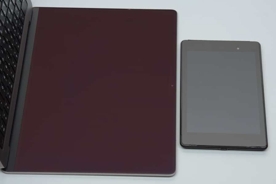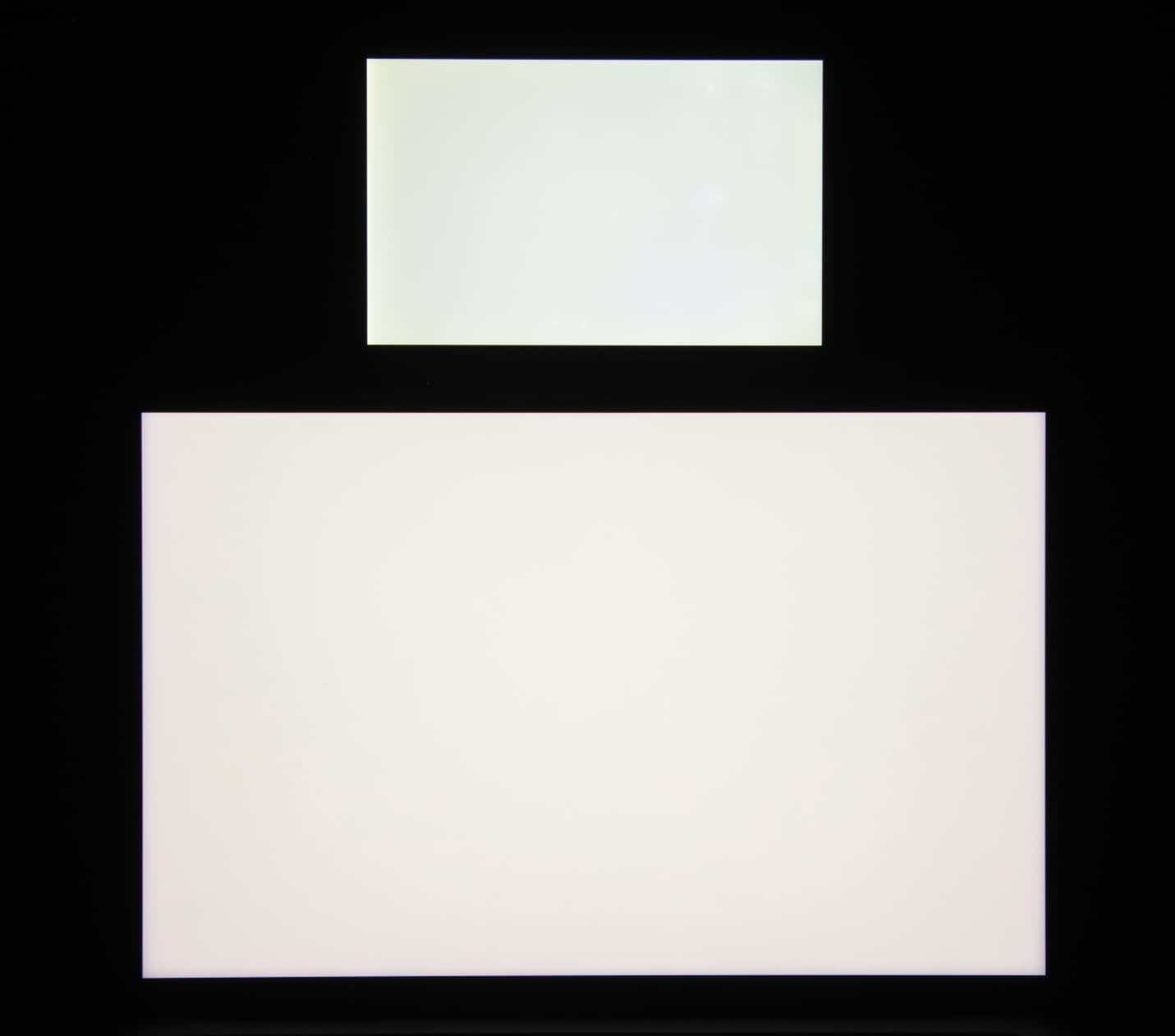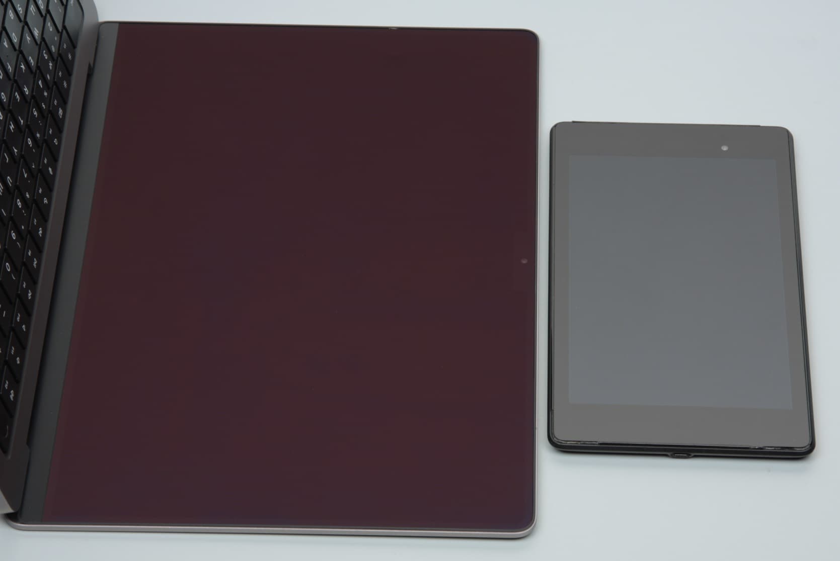 Лицевая поверхность экрана изготовлена, видимо, из стеклянной пластины, по крайней мере жесткость и устойчивость к царапинам имеются. Экран снаружи зеркально-гладкий и обладает слабыми олеофобными (жироотталкивающими) свойствами. Палец по поверхности экрана скользит с меньшим сопротивлением, следы от пальцев появляются не так быстро, а удаляются чуть легче, чем в случае обычного стекла. Судя по яркости отраженных объектов, антибликовые свойства экрана заметно лучше, чем у Google Nexus 7 (2013) (далее просто Nexus 7). Для наглядности приведем фотографию, на которой в экранах обоих устройств отражается белая поверхность (где что — разобраться несложно):