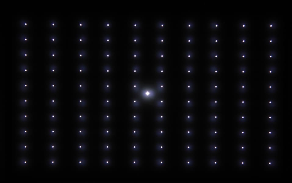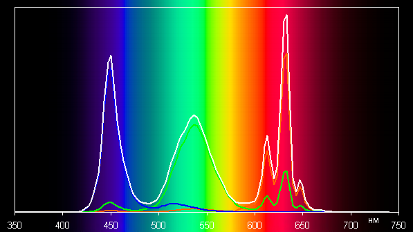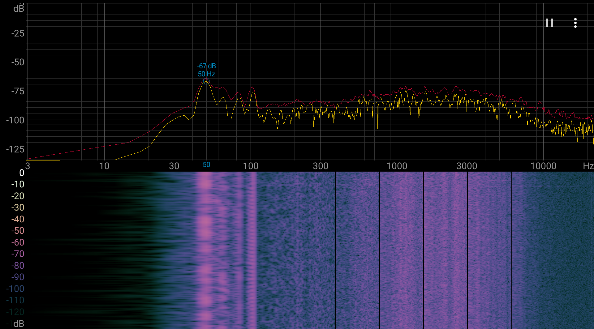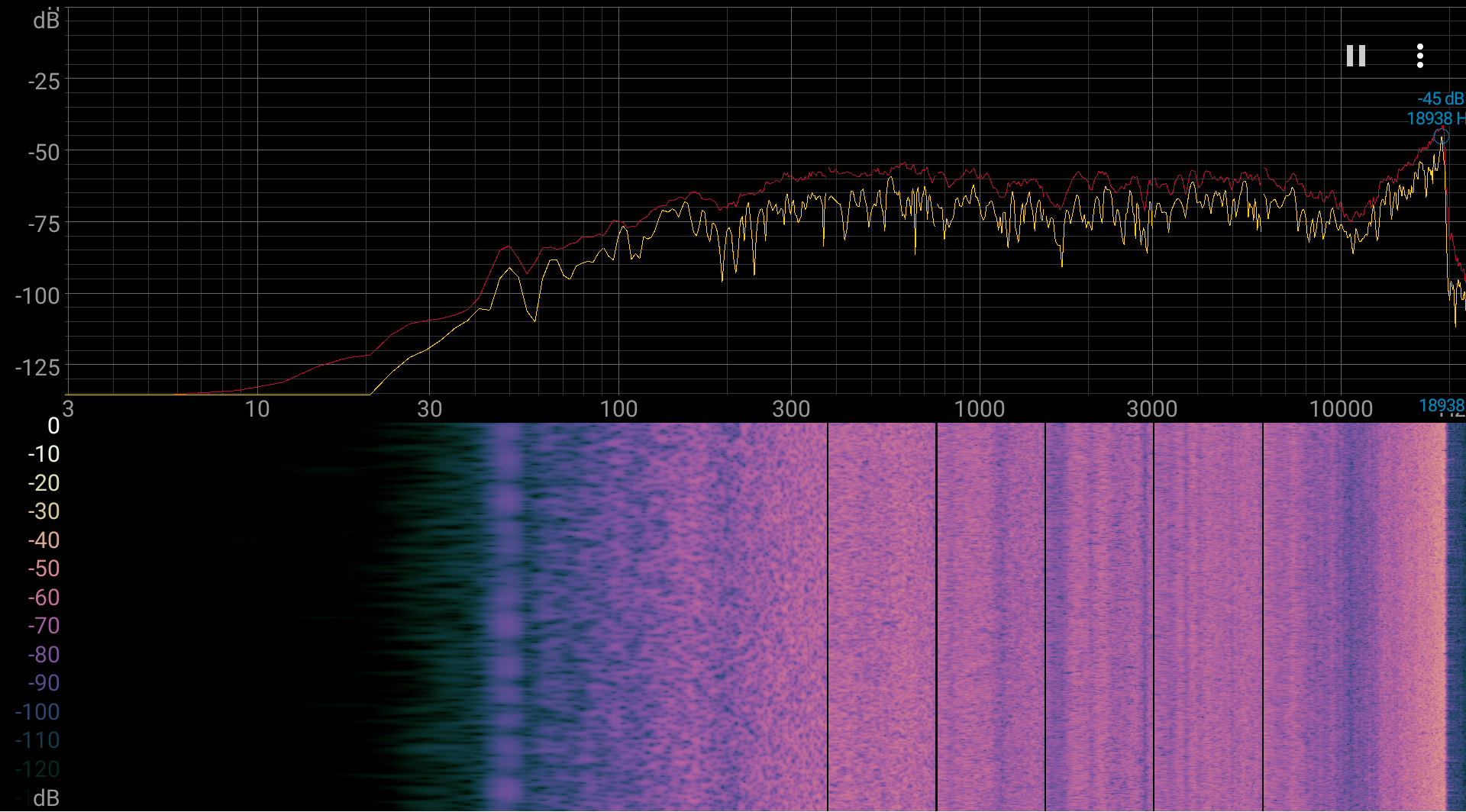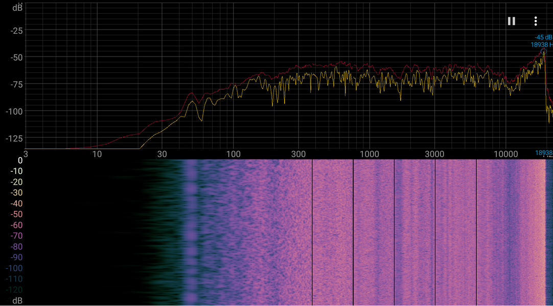 Спектрограмма белого шума показывает, что выраженных резонансных пиков нет (но есть провалы между полосами частот, самый большой — около 10 кГц), самых низких частот ожидаемо нет, в целом от низких до не самых высоких АЧХ довольно ровная: