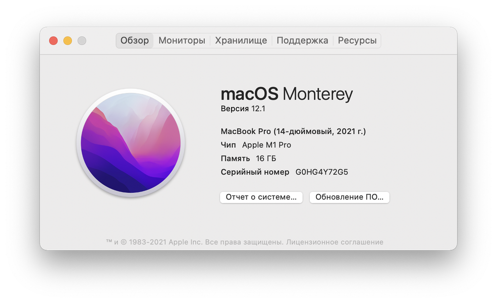 | Процессор | Apple M1 Pro, 8 ядер (6 высокопроизводительных и 2 энергоэффективных) | |