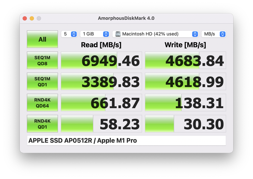 Результаты AmorphousDiskMark 3.1 (это Mac-аналог известной утилиты CrystalDiskMark) подтверждают наблюдения: на верхнем скриншоте слева — новый MacBook Pro 14″, справа — MacBook Pro 16″. А еще ниже, для сравнения, Mac mini на базе Apple M1 и iMac 27″.