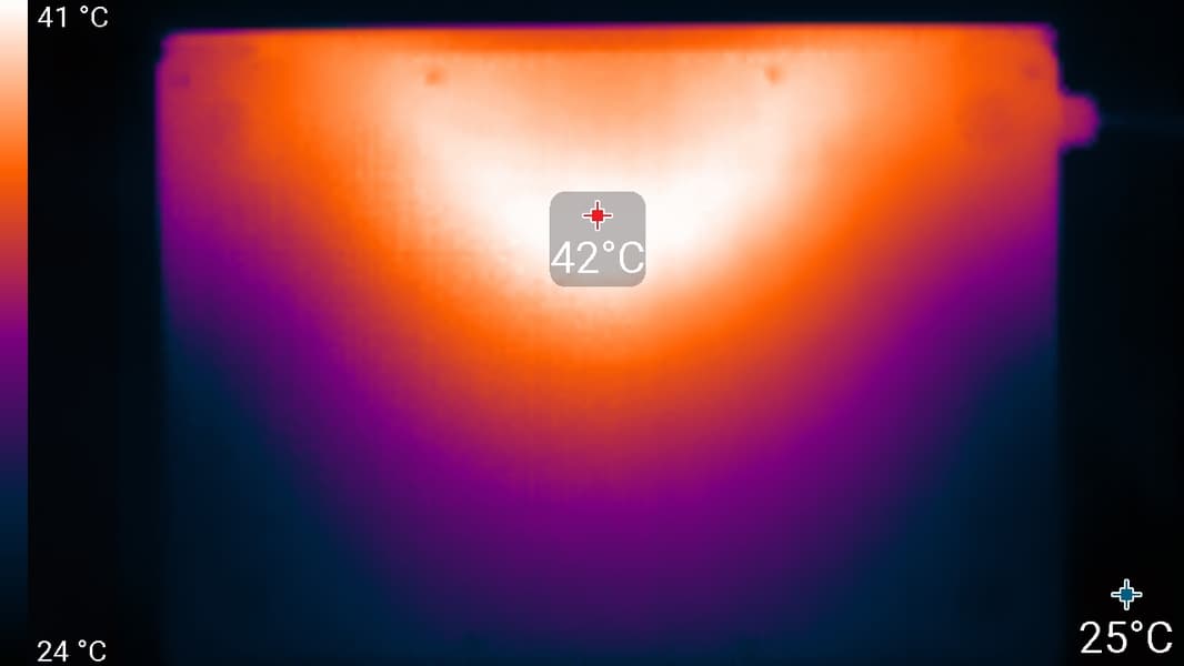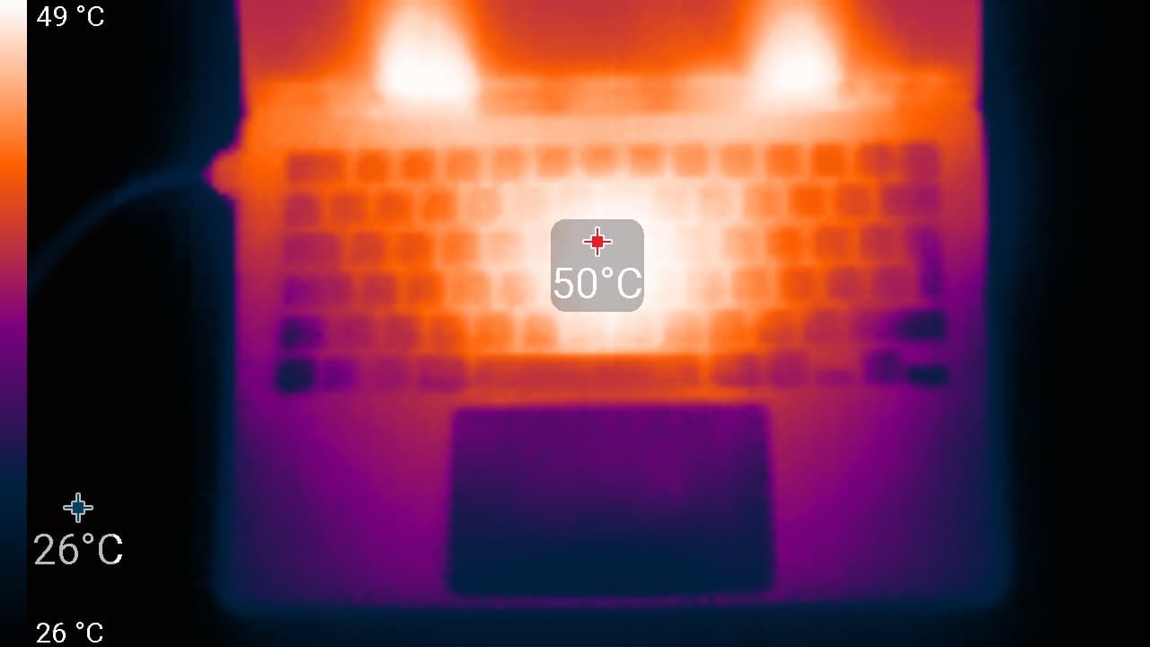 Максимальный нагрев — условно в центре клавиатуры и в двух областях в нижней части экрана, куда выдувается горячий воздух. Там, где обычно находятся запястья пользователя, нагрев тоже чувствуется, что несколько снижает комфорт от работы за ноутбуком.