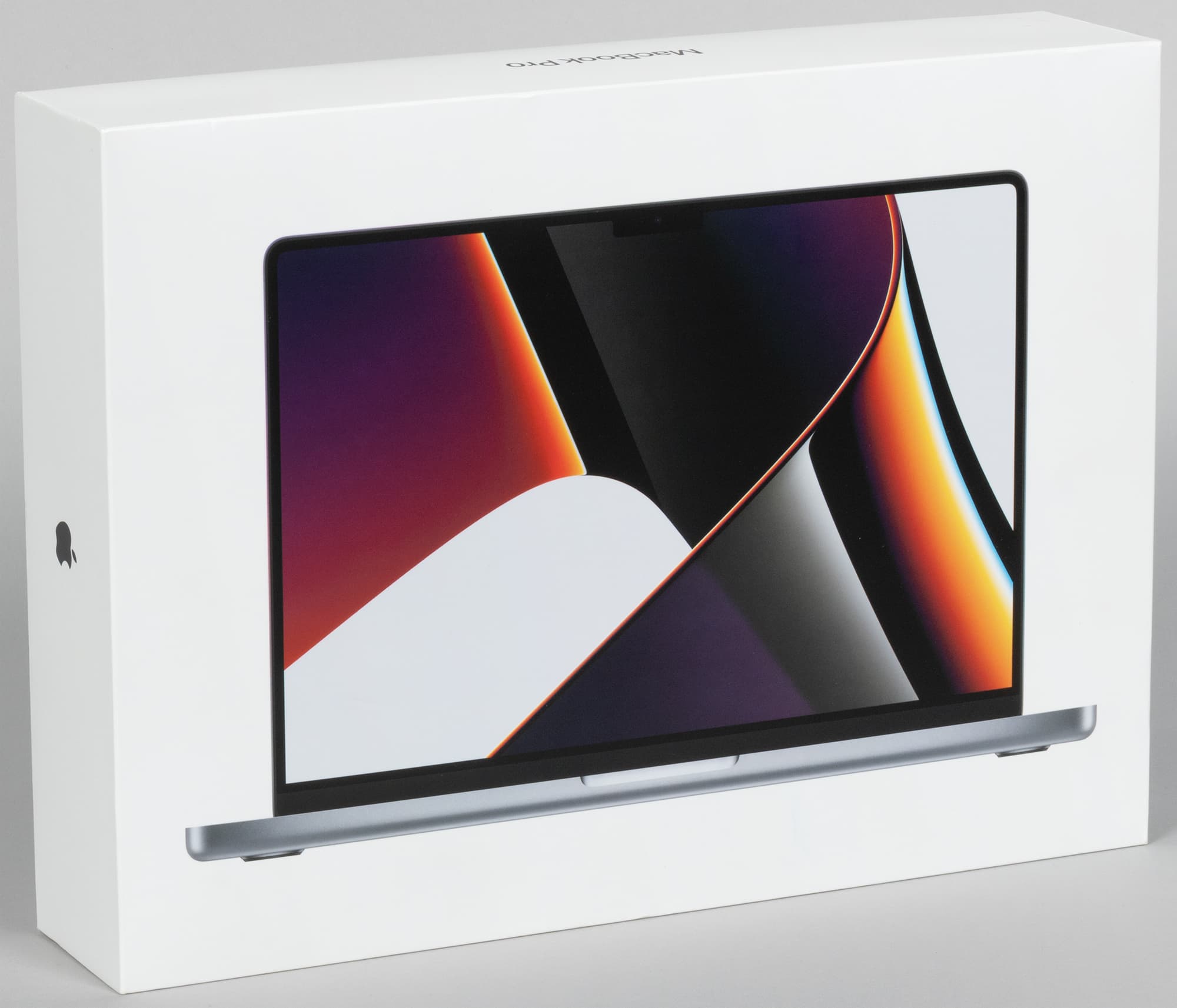 Упаковка MacBook Pro 14″ внешне идентична старшей модели. Даже рисунок тот же. Отличие только в размере коробки.