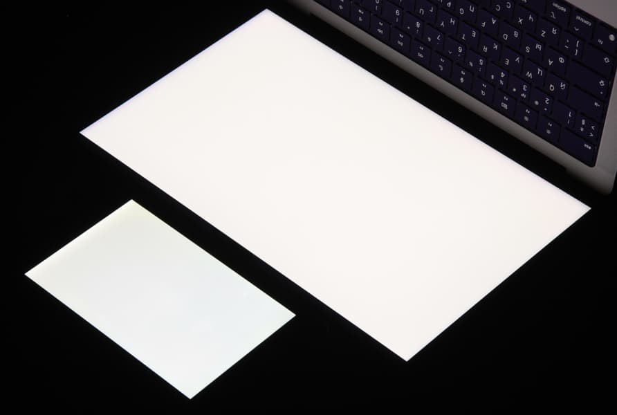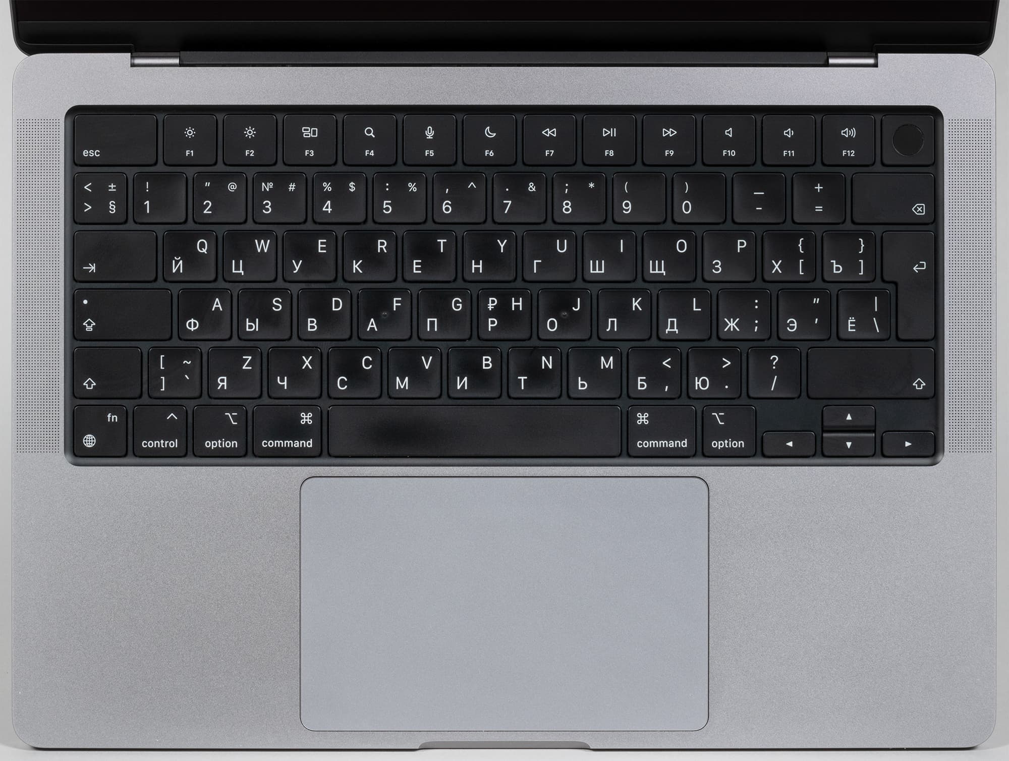 Добавим лишь, что размер всех клавиш и раскладка клавиатуры у моделей идентична, а экономия пространства в случае с 14-дюймовым ноутбуком достигается за счет уменьшения сеток над динамиками по бокам. Кроме того, у более компактного устройства поменьше тачпад. Сравните фотографии MacBook Pro 14″...