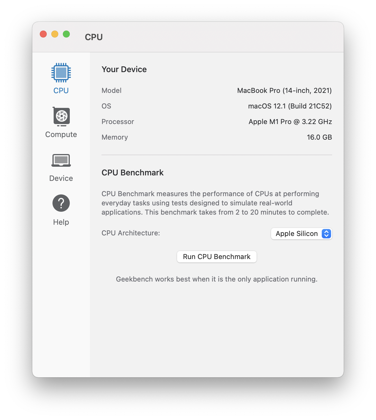 Итак, основа MacBook Pro, попавшего к нам на тест — однокристальная система (SoC) Apple M1 Pro, в которой 6 высокопроизводительных процессорных ядер и еще 2 энергосберегающих. Как и в случае с другими моделями на Apple Silicon, производитель не указывает частоту CPU-ядер.
