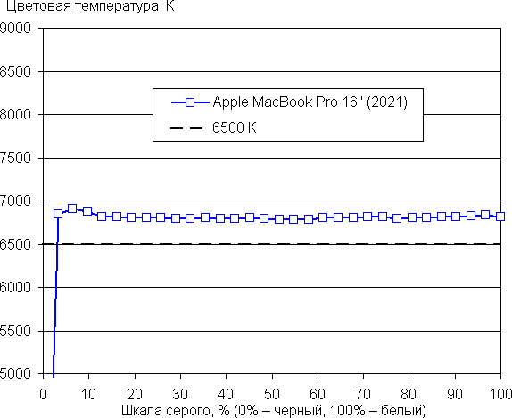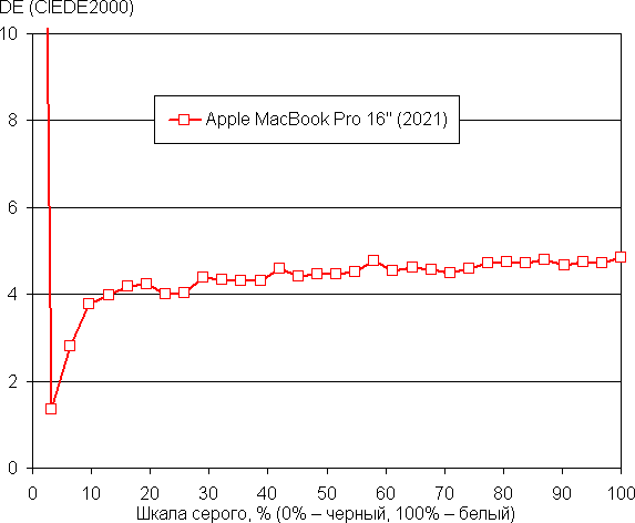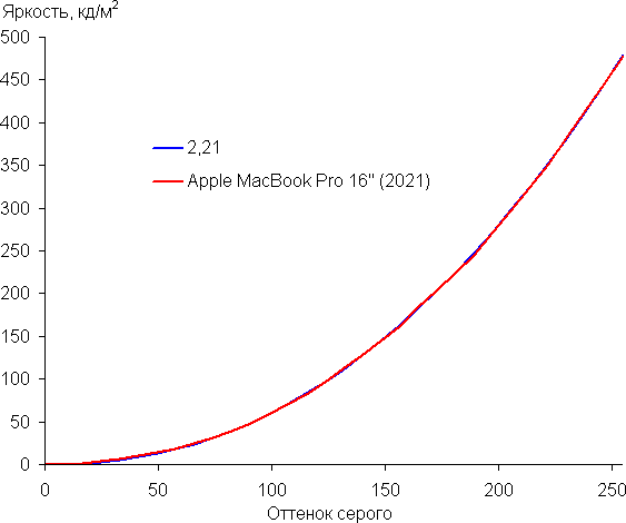 Теперь хорошо видно, насколько экран у Apple MacBook Pro 16″ (2021) темнее. С практической точки зрения антибликовые свойства экрана настолько хороши, что даже прямое отражение ярких источников света не сильно мешает работе. Никакого существенного двоения отраженных в экране объектов мы не обнаружили, то есть воздушного промежутка в слоях экрана нет, что, впрочем, ожидаемо для современного ЖК-экрана без сенсорного слоя.