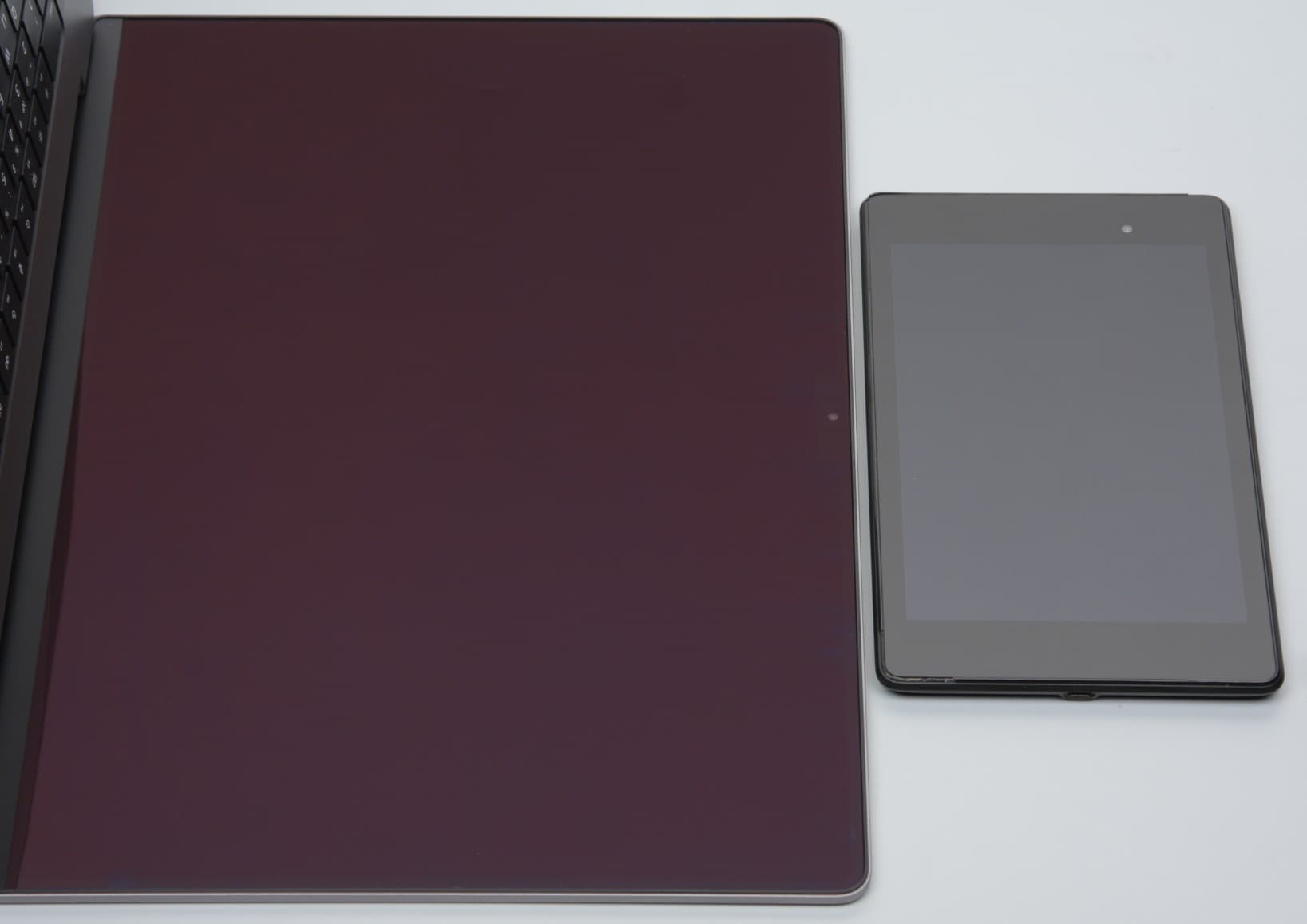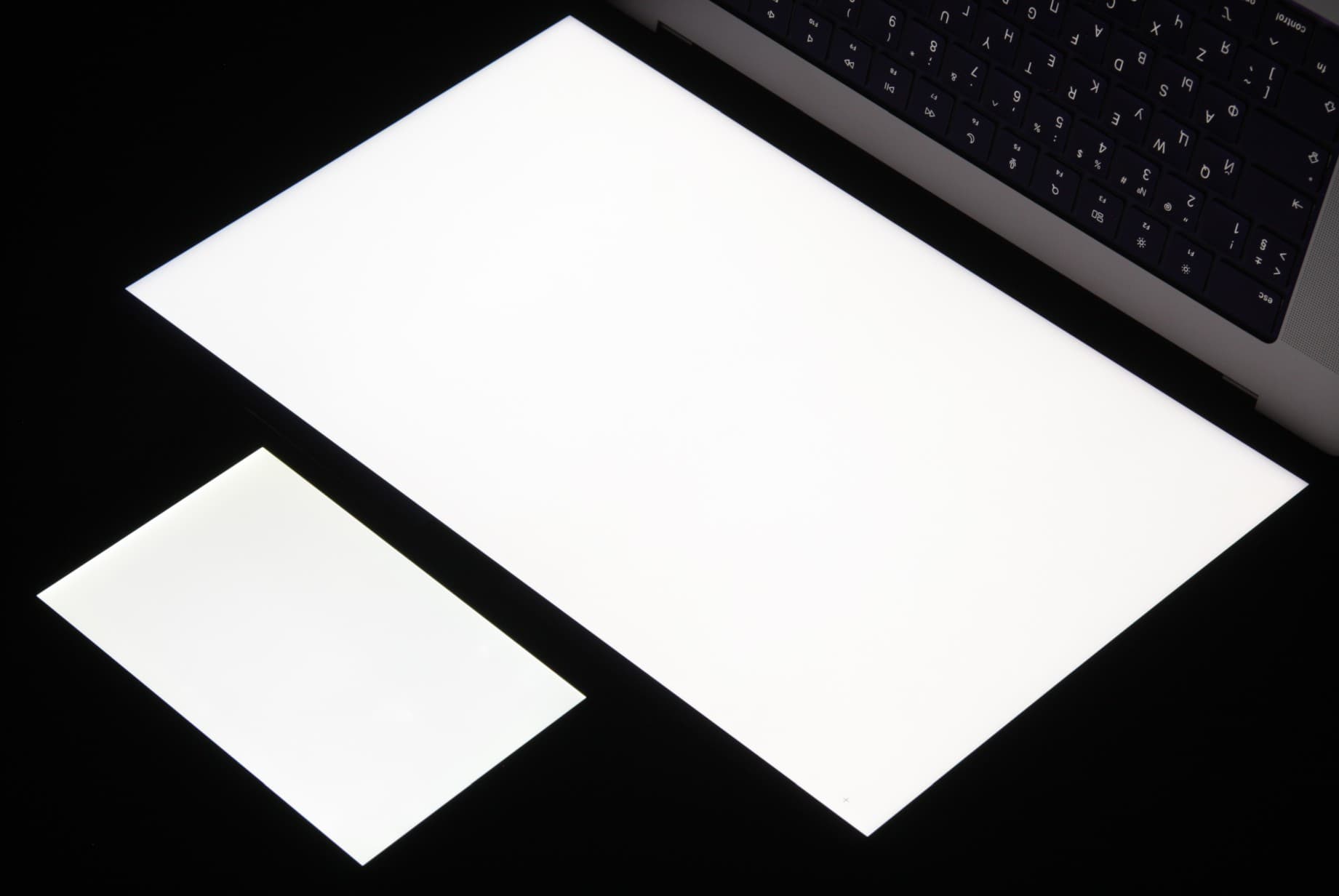 Экран имеет хорошие углы обзора без значительного сдвига цветов даже при больших отклонениях взгляда от перпендикуляра к экрану и без инвертирования оттенков. Для сравнения приведем фотографии, на которых на экраны Apple MacBook Pro 16″ (2021) и Nexus 7 выведены одинаковые изображения, при этом яркость экранов изначально установлена примерно на 200 кд/м² (по белому полю во весь экран), а цветовой баланс на фотоаппарате принудительно переключен на 6500 К. Перпендикулярно к экранам белое поле: