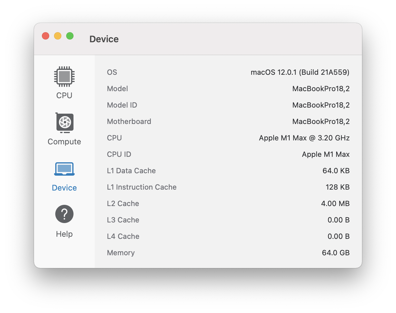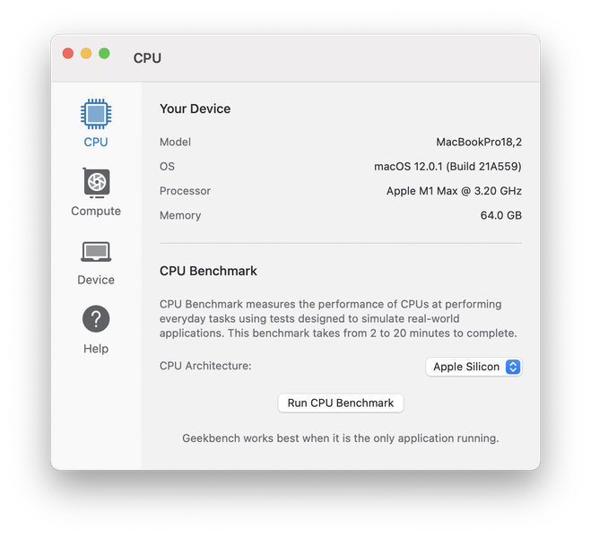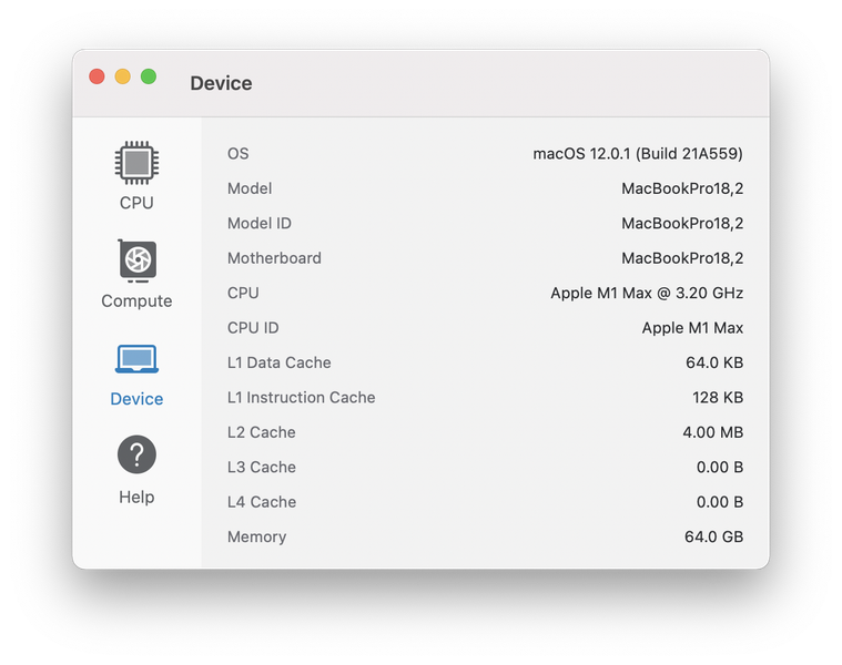 Итак, основа MacBook Pro, попавшего к нам на тест — однокристальная система (SoC) Apple M1 Max, в которой 8 высокопроизводительных процессорных ядер и еще 2 энергосберегающих. Как и в случае с другими моделями на Apple Silicon, производитель не указывает частоту CPU-ядер.