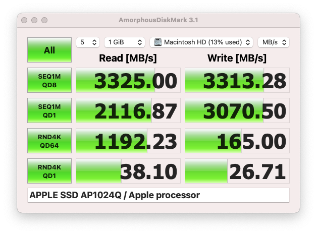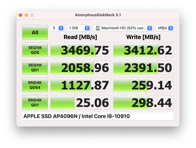 AmorphousDiskMark 3.1 — Mac-аналог известной утилиты CrystalDiskMark — подтверждает наблюдения. Результаты новинки — на верхнем скриншоте, а ниже, для сравнения, Mac mini на базе Apple M1 и iMac 27″.