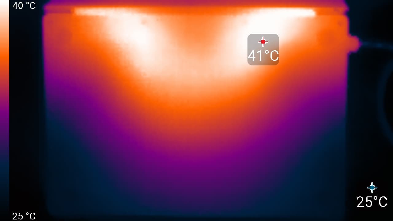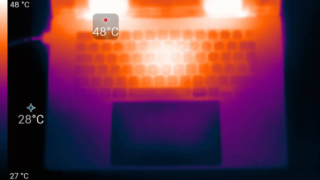 Максимальный нагрев — в условно в центре клавиатуры и в двух областях в нижней части экрана, куда выдувается горячий воздух. Там, где обычно находятся запястья пользователя, нагрев не чувствуется, что повышает комфорт от работы за ноутбуком.