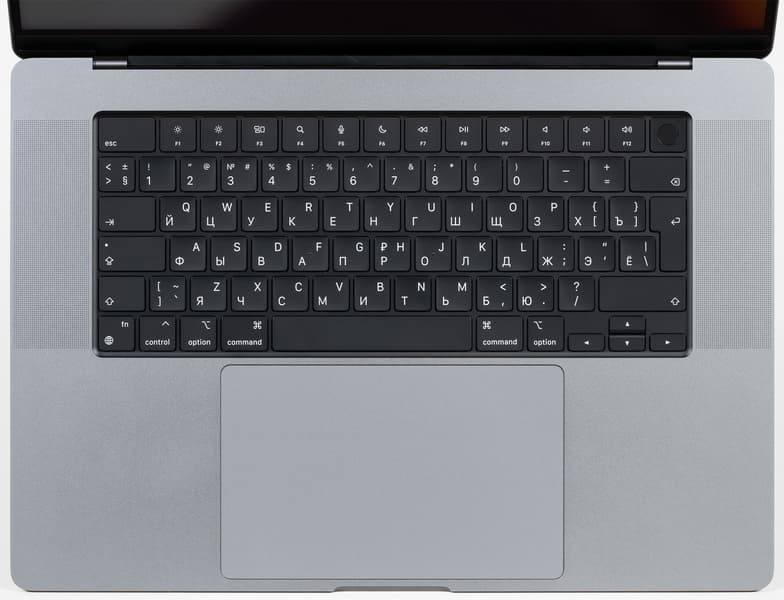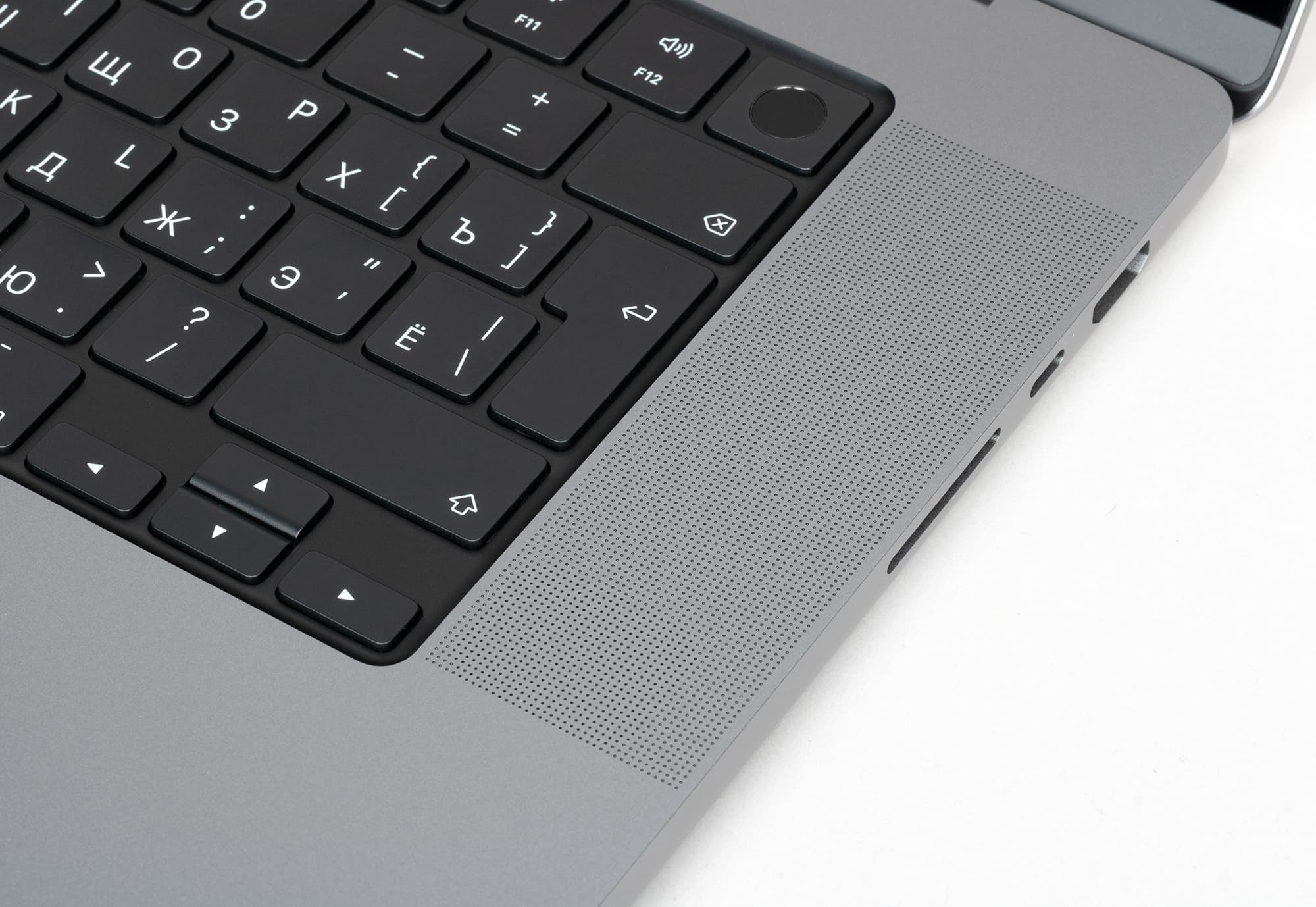 Ну и, конечно, важнейшая особенность — новая клавиатура с более глубоким ходом клавиш и традиционным рядом функциональных кнопок вместо уже привычного Touch Bar. Немного даже странно, что Apple так демонстративно отказывается от собственных разработок последних лет, фактически признавая их ошибкой. У Touch Bar была интересная идея, однако, похоже, пользователей так и не удалось приучить к использованию этой панели. Автор данного текста использовал на Touch Bar только регулировку громкости и яркости, а также Esc. Потому что все остальное было не очень интуитивным (хотя и гипотетически удобным), а приучать себя не хотелось. Теперь вопрос снят. И отдельно хочется отметить кнопку с датчиком Touch ID: она теперь гораздо крупнее, поэтому попасть по ней легче. Раньше палец часто попадал на соседнюю Siri.