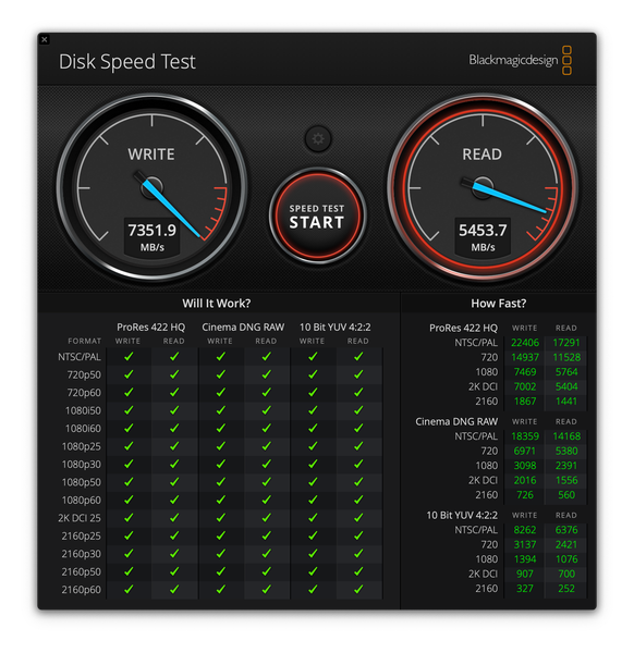 Если перечисленные выше бенчмарки помогают нам оценить производительность CPU и GPU, то BlackMagic Disk Speed ориентирован на тестирование накопителя: он измеряет скорость чтения и записи файлов.