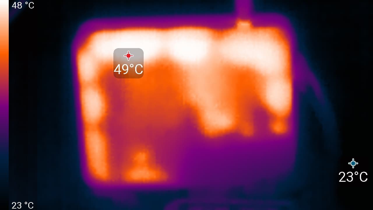 Нагрев снизу довольно высокий, и, если держать ноутбук на коленях, то тепло чувствуется, в жару так работать будет некомфортно. Блок питания при этом нагрелся весьма существенно, поэтому при долговременной работе с высокой производительностью обязательно нужно следить, чтобы он не был ничем накрыт: