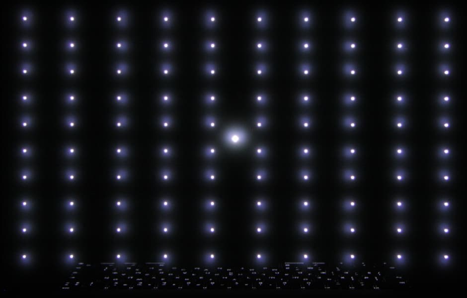 Дело в том, что данный экран оснащен прямой многозонной светодиодной подсветкой: сзади непосредственно за ЖК-матрицей находится матрица из светодиодов подсветки. Каждый светодиод или группа светодиодов, образующих одну зону, управляется независимо от остальных. Потенциально это позволяет получить хорошую равномерность подсветки по площади экрана, а также локально подсвечивать яркие участки изображения и затемнять темные, улучшая тем самым контраст изображения. Так как зон подсветки во много раз меньше, чем пикселей в матрице, то каждая зона освещает область из тысяч пикселей (на самом деле, границы не четкие). Из-за этого на некоторых типах изображений при большом желании можно увидеть артефакты в виде локальной засветки вокруг или около ярких объектов. Например, так это выглядит в случае тестового изображения с белыми точками и курсором мыши (для наглядности мы увеличили ISO и выдержку снимка, в нижней части отражается клавиатура):