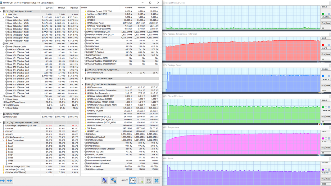 В ноутбуке используется мобильный CPU AMD Ryzen 9 5900HX на микроархитектуре Zen3 (8 ядер, 16 потоков). Официальные частоты составляют 3,3/4,6 ГГц, тепловыделение — 45+ Вт (предусмотрена настройка потребления в диапазоне 35—54 Вт). В наших тестах под нагрузкой центральному процессору удавалось отбирать 70-75 Вт мощности, то есть в случае профиля Turbo наблюдается традиционный для этого режима разгон процессора.