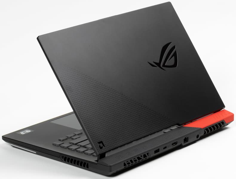 На задней панели заметны решетки отверстий, через которые наружу выбрасывается горячий воздух. Как заведено у производителя, левая решетка образована римскими цифрами MMVI (то есть 2006) — это год рождения серии Asus ROG. Далее помещаются разъемы USB Type A, USB Type С, HDMI, коннектор гигабитного сетевого интерфейса RJ-45 и гнездо для подключения адаптера питания.