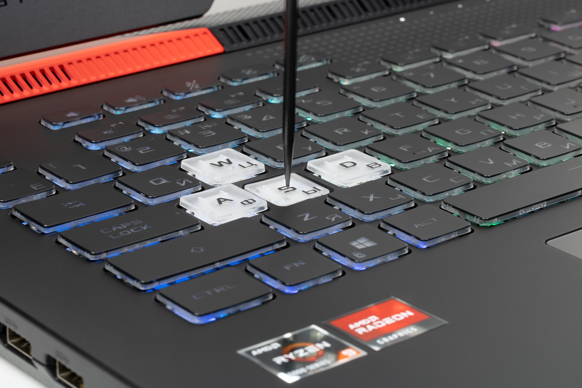 Поверх всех расположен ряд из пяти настроечных кнопок: уменьшить звук, увеличить звук, включить и выключить встроенный микрофон, изменить текущий профиль производительности (Silent—Performance—Turbo), запустить приложение Armoury Crate. Последние элементы специфичны для ноутбуков Asus ROG и не имеют аналогов в стандартной десктопной раскладке.