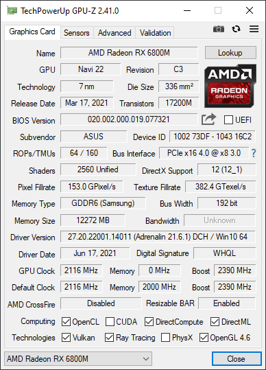 Испытания ноутбука, результаты которых описаны в этом разделе, мы проводили с использованием его дискретного видеоускорителя AMD Radeon RX 6800M. Это самое быстродействующее видеорешение в новой линейке AMD Radeon RX Mobile Graphics, оснащенное максимумом доступной видеопамяти. Пользуясь случаем, приведем в таблице ниже сравнение некоторых параметров мобильных видеокарт AMD Radeon серии RX 6000.