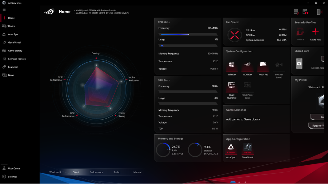 Приложение Armoury Crate отвечает за настройки аппаратных компонентов. Эту утилиту можно запустить нажатием пятой кнопки слева в самом верхнем ряду клавиатуры. Наиболее важная и полезная функция Armoury Crate — выбор пресетов (профилей) работы, определяющих производительность ноутбука и интенсивность работы кулеров.