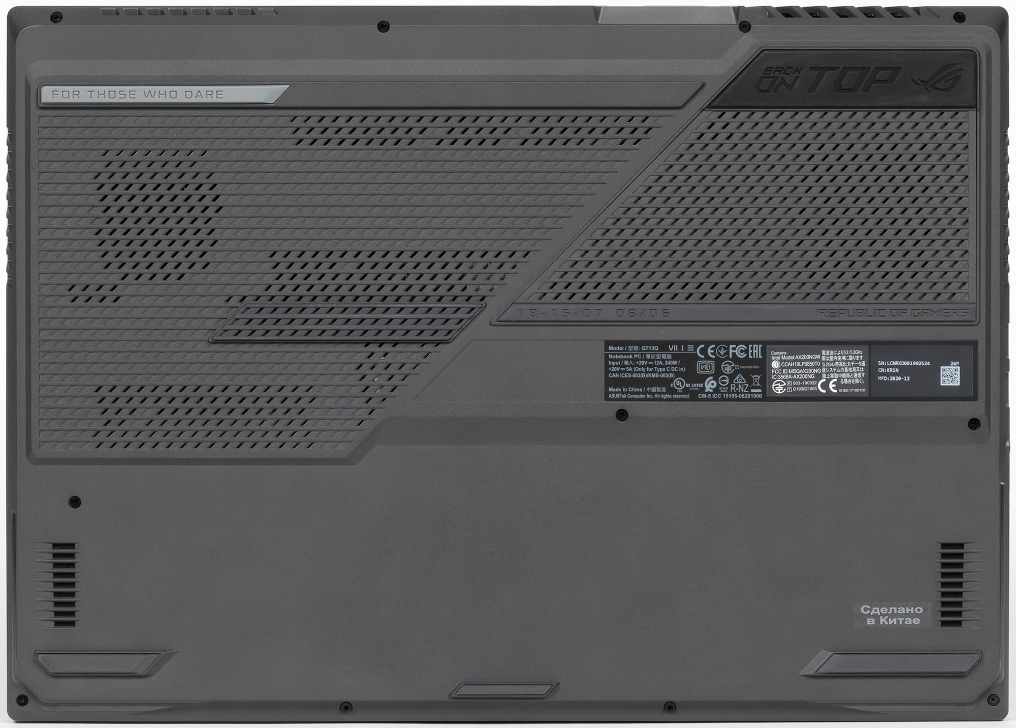 Толщина корпуса у Asus ROG Strix G17 G713QR (без учета ножек) составляет всего 23 мм — для мощной портативной игровой системы это совсем немного. Поэтому система охлаждения использует внутренний объем с максимальной эффективностью, и движение воздуха в нем происходит в шести направлениях одновременно: относительно холодный забортный поступает через отверстия на днище корпуса и на декоративных решетках верхней панели — там, где последняя имеет возвышение, — а выброс горячего производится двумя вентиляторами через четыре радиатора (два назад, один направо и один налево).