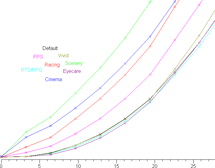 Мы провели измерения яркости в 25 точках экрана, расположенных с шагом 1/6 от ширины и высоты экрана (границы экрана не включены). Контрастность вычислялась как отношение яркости полей в измеряемых точках: