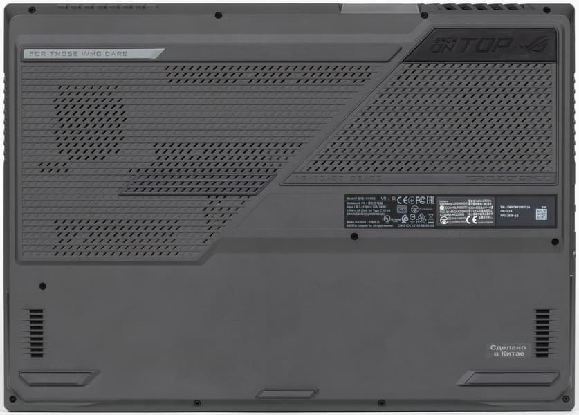 Крышка металлическая, серо-черная с матовой поверхностью. Отпечатки пальцев, образующиеся при прикосновении к ней, заметны в меньшей степени, чем на глянце, и к тому же легко стираются. Угол крышки заполнен массивом букв аббревиатуры ROG, нанесенных, вероятно, методом лазерной гравировки. Они почти неразличимы невооруженным глазом и кажутся просто мелкими квадратиками.