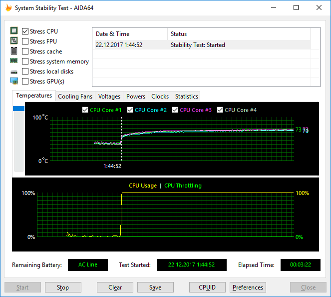 Температура ядер процессора при этом достигает 75 °C, а мощность энергопотребления процессора — 26 Вт.