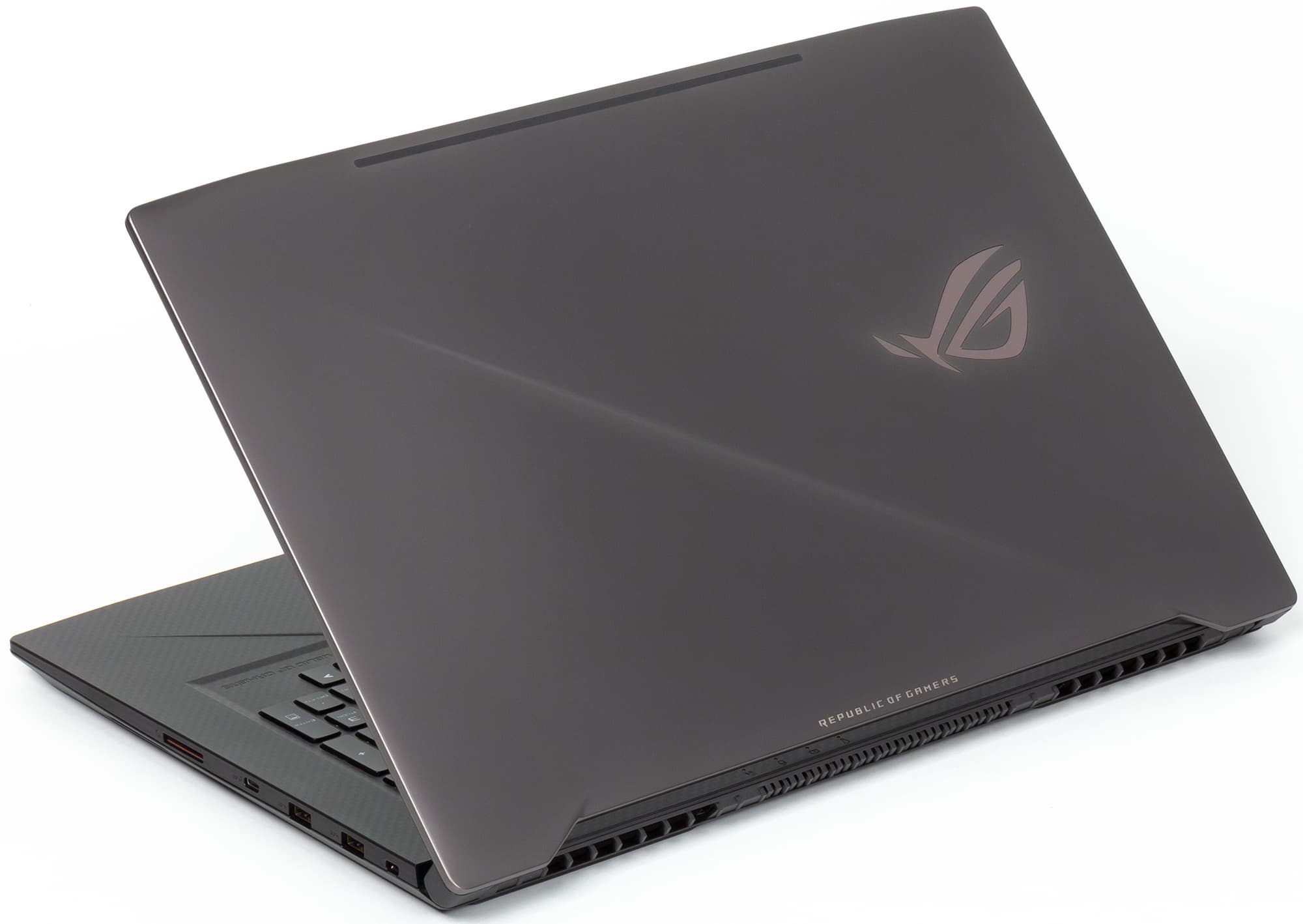 Корпус ноутбука Asus ROG Strix GL703GM выполнен из металла и пластика. Крышка ноутбука сверху выполнена из тонкого листа алюминия черного цвета.