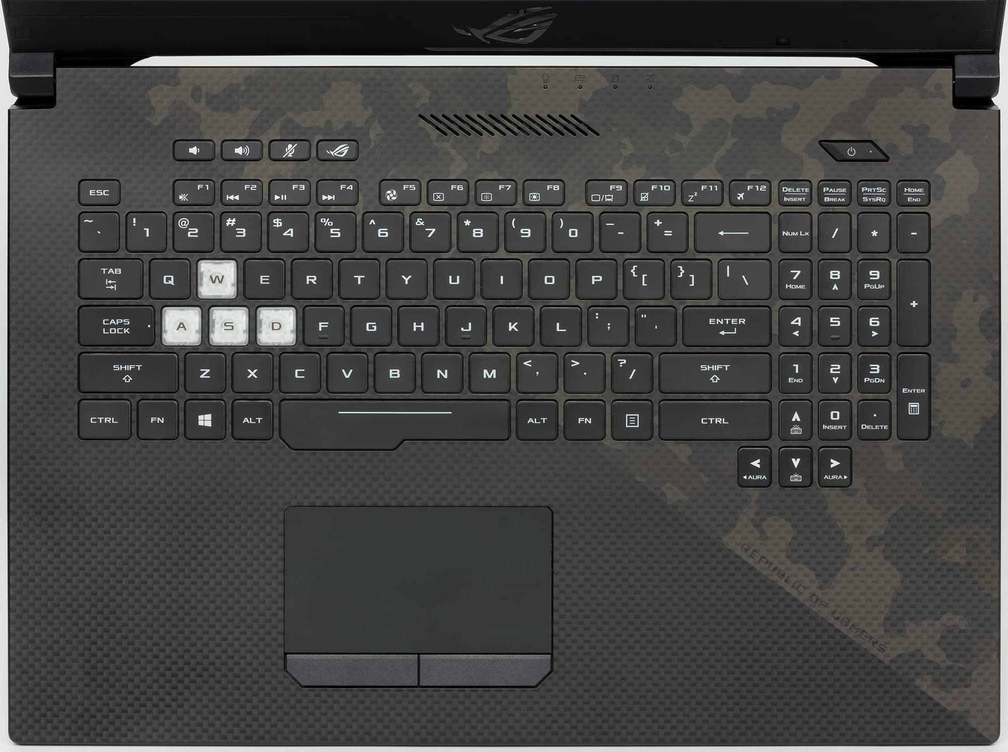 Поскольку данный ноутбук ориентирован на любителей шутеров, здесь выделена зона игровых клавиш WASD: у этих клавиш прозрачные шляпки.