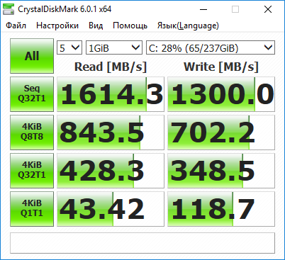 Утилитам CrystalDiskMark демонстрирует схожий результат.