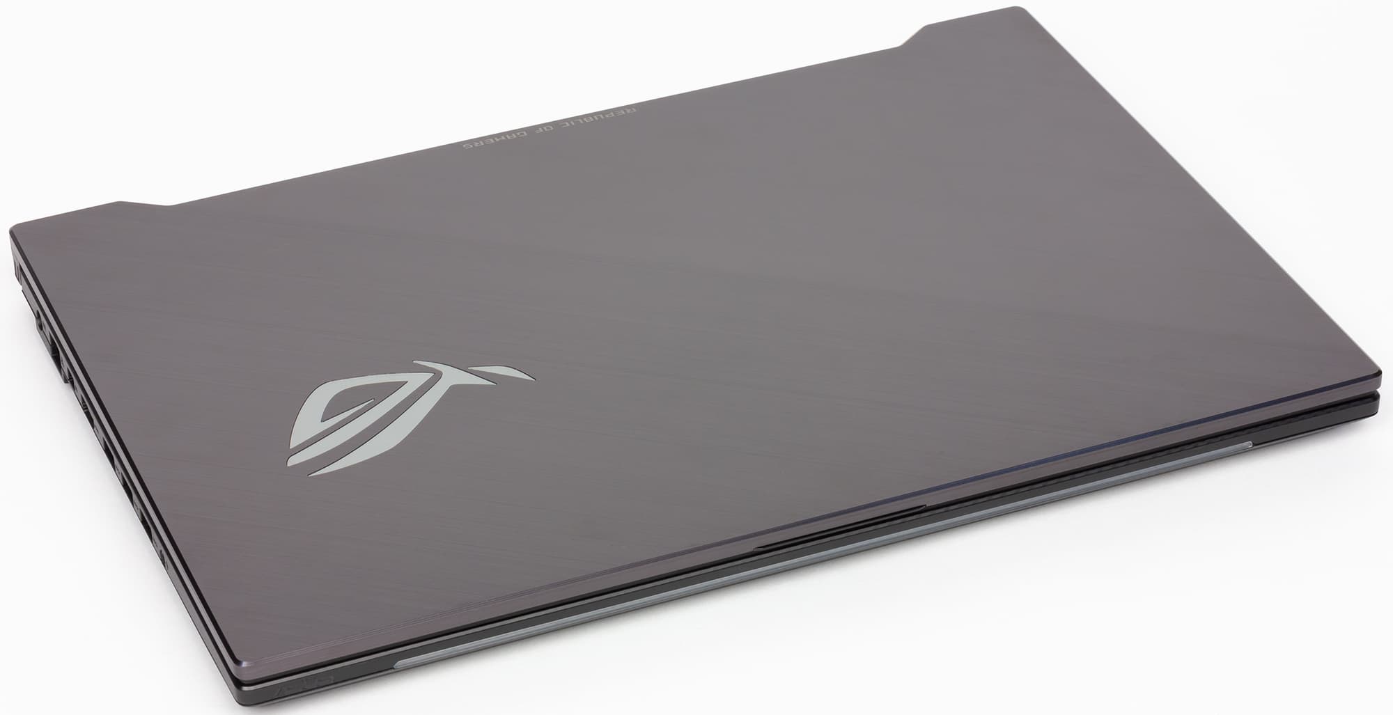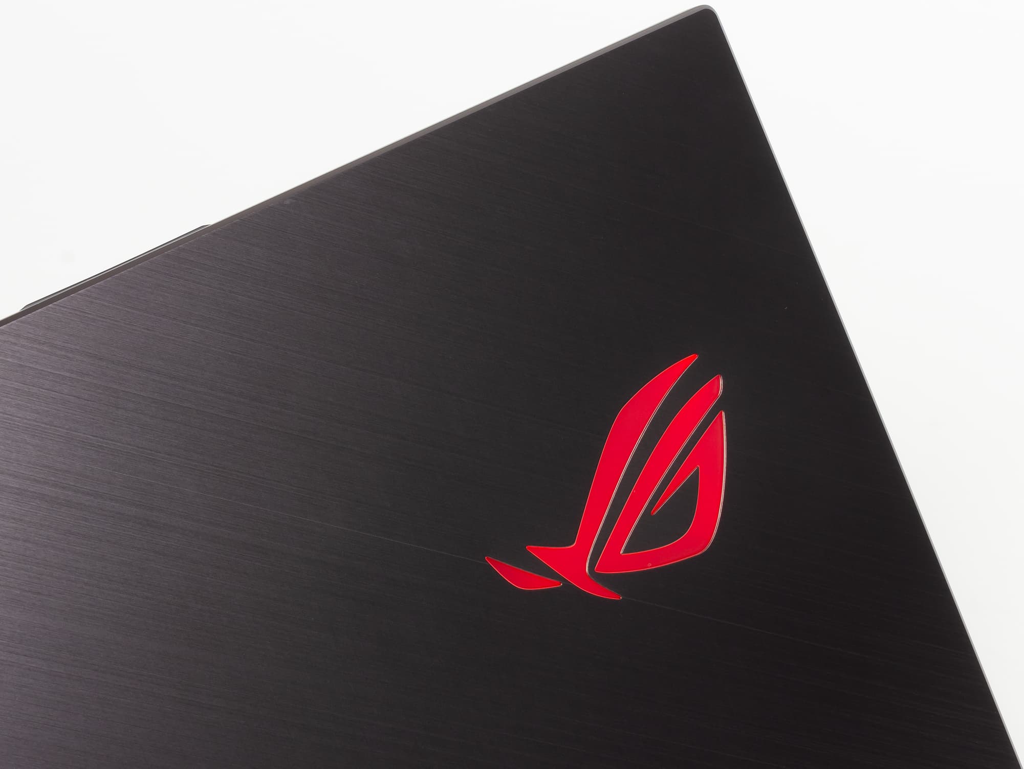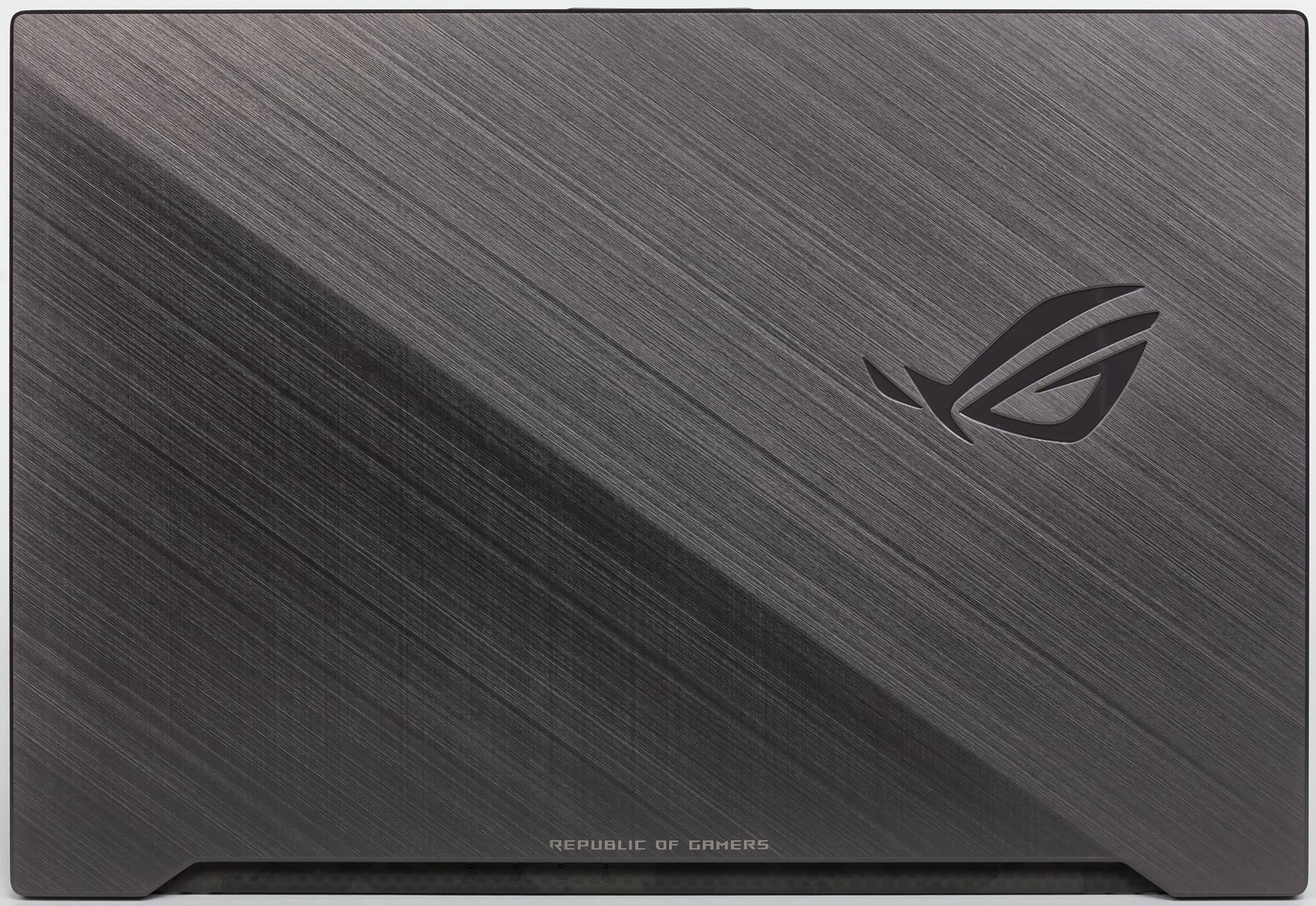 Корпус ноутбука выполнен из пластика темно серого цвета. На крышке сверху красуется зеркальная эмблема игровой серии ROG, которая подсвечивается красным цветом при включении ноутбука. Крышка однотонная, но диагональю она делится на две части, обе части текстурированы под шлифованный металл, но шлифовки разные.