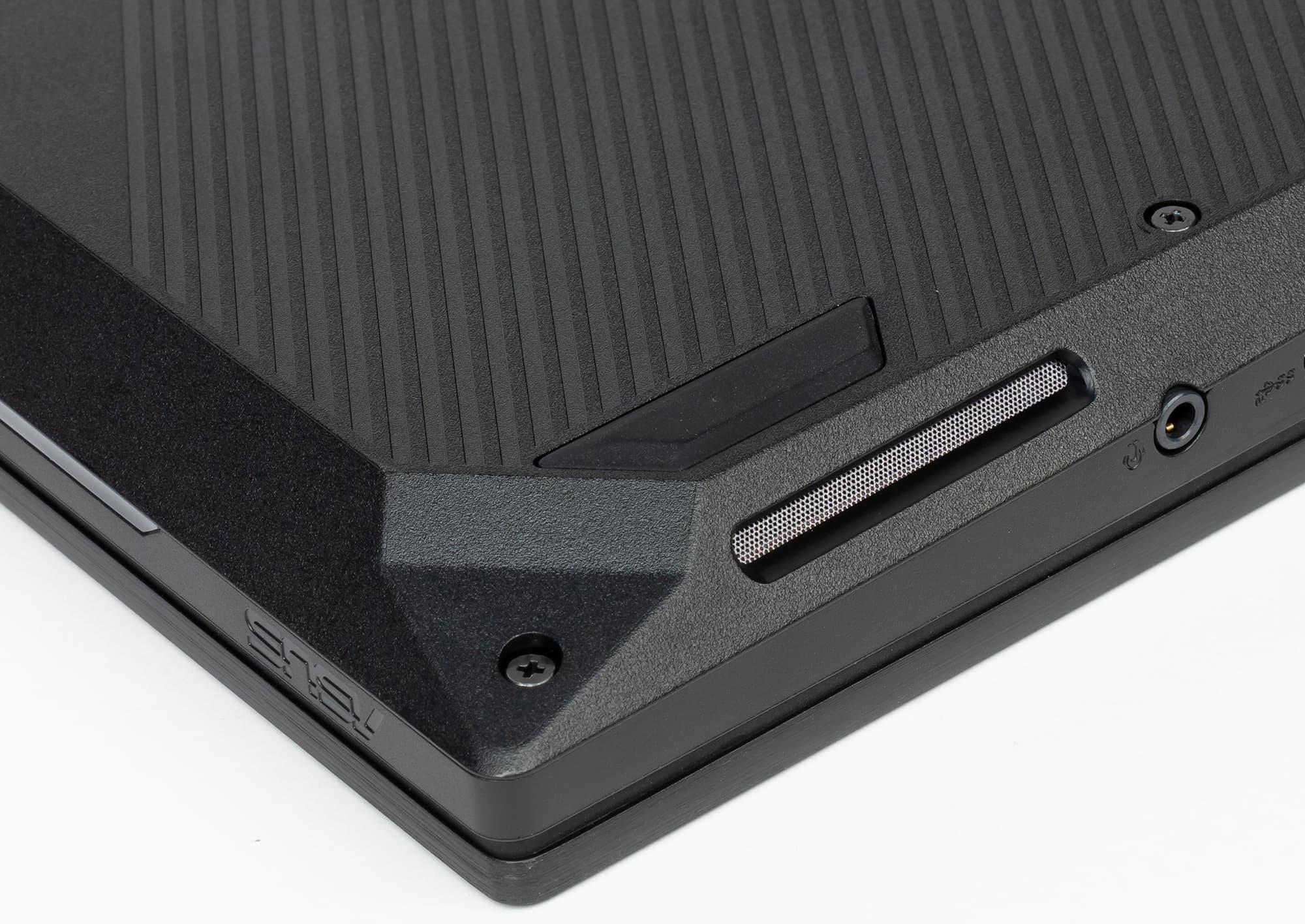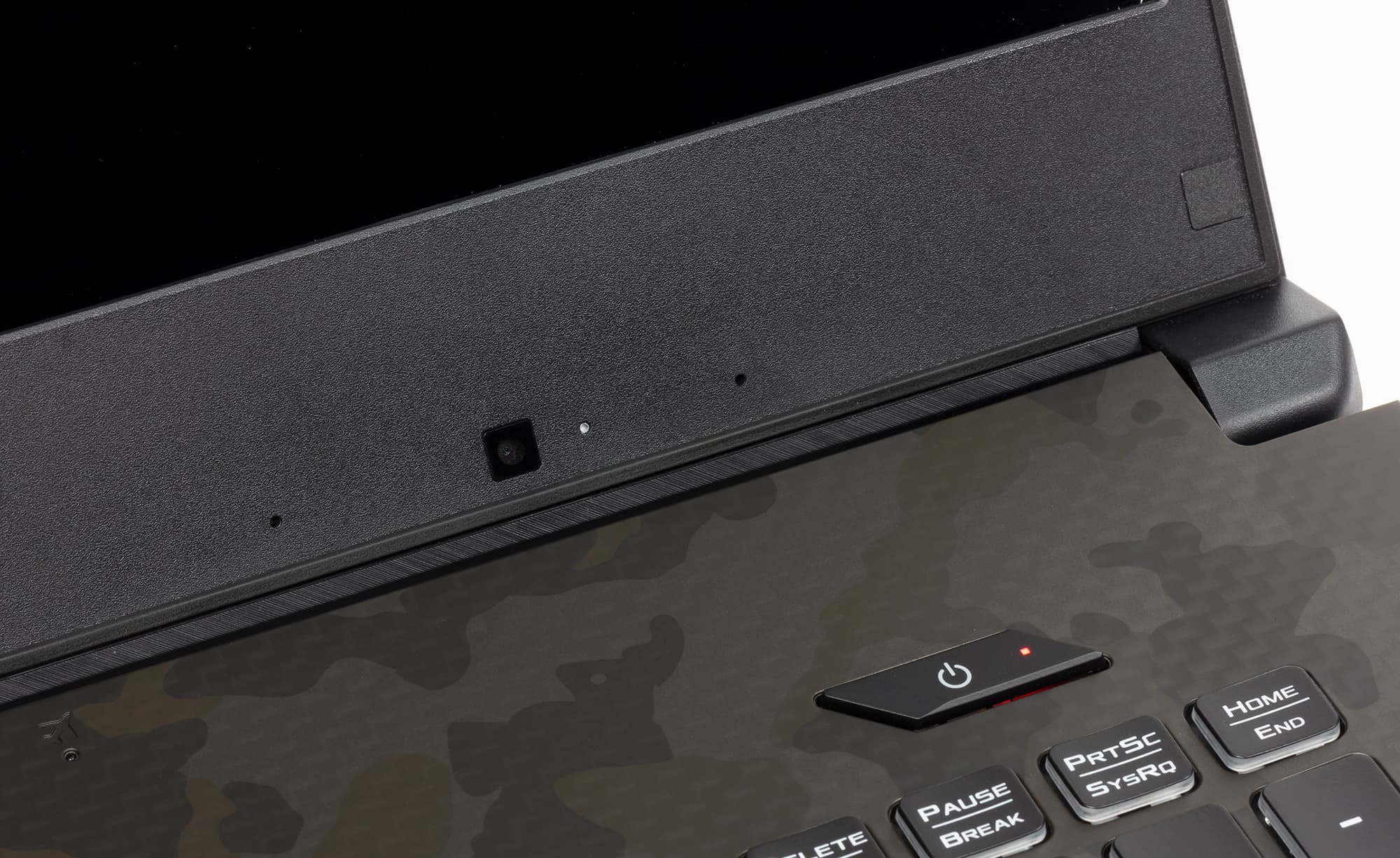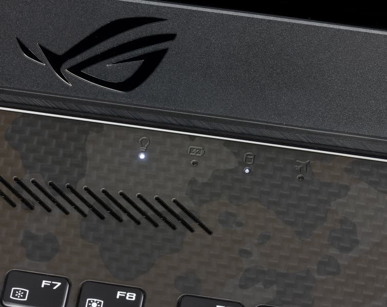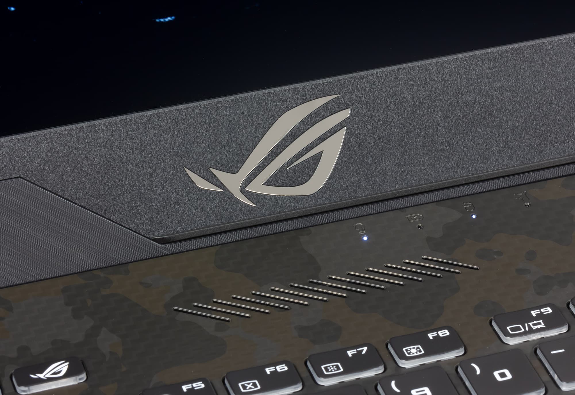 Толщина рамки вокруг экрана с боков и сверху — всего 7 мм, поэтому веб-камера и микрофоны расположены на нижней части рамки экрана. Тут же расположен и зеркальный логотип серии ROG.