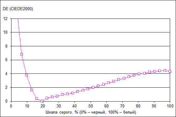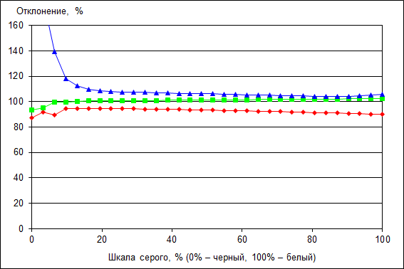 Что касается точности цветопередачи (дельта Е), то ее значение не превосходит 4 по всей шкале серого (темные области можно не учитывать), что очень неплохо для данного класса экранов.