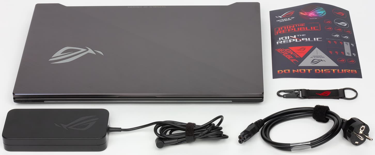 Asus ROG Strix GL704GM Scar II поставляется в небольшой картонной коробке черного цвета с ручкой, традиционной для ноутбуков игровой серии ROG. Кроме самого ноутбука в комплект поставки входит краткое руководство пользователя, гарантийный талон, адаптер питания мощностью 180 Вт (19,5 В; 9,23 A), стикеры и карабин для ключей с логотипом ROG.