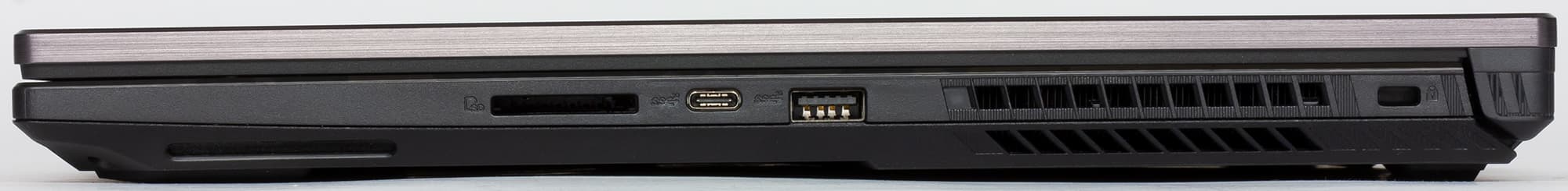 На правом торце имеется порт USB 3.1 (Type-A), порт USB 3.1 (Type-C), слот для карт памяти и отверстие для кенсингтонского замка.