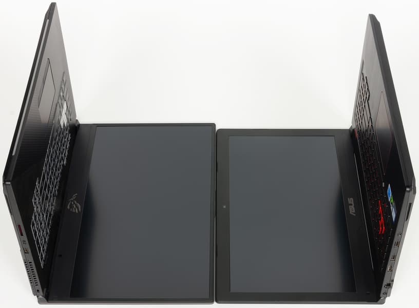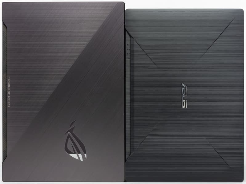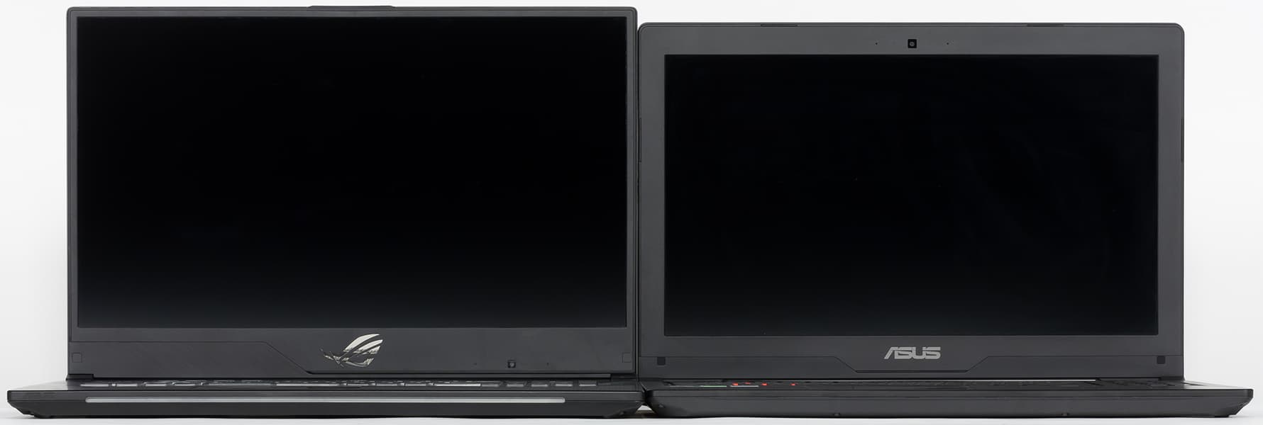 Тот факт, что у экрана ноутбука очень тонкая рамка, имеет не только эстетическое значение. За счет тонкой рамки габаритные размеры этого 17-дюймового ноутбука лишь немногим больше, чем у 15-дюймового ноутбука с обычной (толстой) рамкой. На фотографиях далее представлены для сравнения два ноутбука: 17-дюймовый Asus ROG Strix GL704GM Scar II с тонкой рамкой экрана (слева) и 15-дюймовый с обычной рамкой экрана (справа).