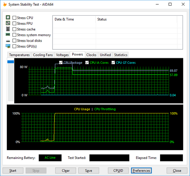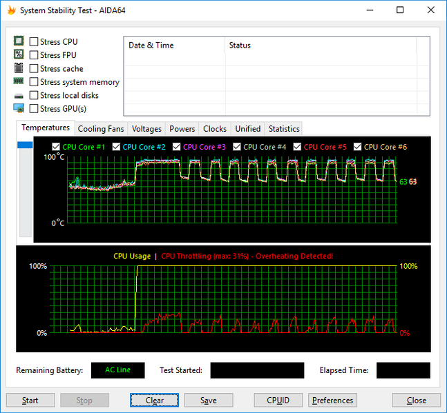 Для анализа работы ноутбука мы использовали три уровня нагрузки процессора: умеренную, высокую и экстремально высокую. Умеренная загрузка создавалась с использованием теста Stress CPU из пакета AIDA64, для имитации высокой загрузки процессора использовался теста Stress FPU из того же пакета AIDA64, а экстремально высокая загрузка создавалась с помощью теста Small FFT программы Prime95. Стрессовая загрузка видеокарты осуществлялась с помощью утилиты FurMark. Мониторинг проводился с использованием утилит AIDA64 и CPU-Z.