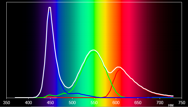 Светофильтры ЖК-матрицы неплохо выделяют спектры основных цветов. Но в области красного спектр немного заужен.