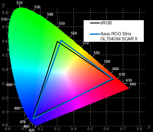 Цветовой охват ЖК-экрана в ноутбуке Asus ROG Strix GL704GM Scar II покрывает 85,5% пространства sRGB и 62,4% Adobe RGB, а объем цветового охвата составляет 93,5% от объема sRGB и 64,4% от объема Adobe RGB. Это хороший цветовой охват.