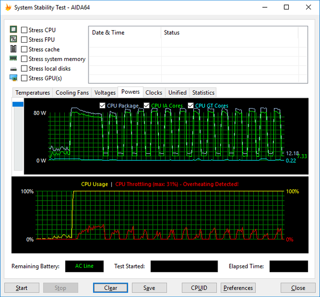 Рассмотренные выше режимы показывают, что в случае, когда загружен только процессор, система охлаждения ноутбука вполне справляется. При этом частота процессора остается достаточно высокой при приемлемой температуре. Никакого троттлинга не наблюдается.