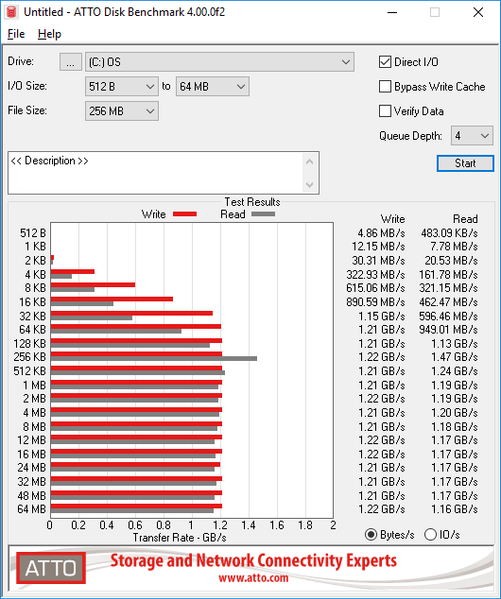 Утилита ATTO Disk Benchmark определяет его максимальную скорость последовательного чтения и записи на уровне 1,2 ГБ/с.