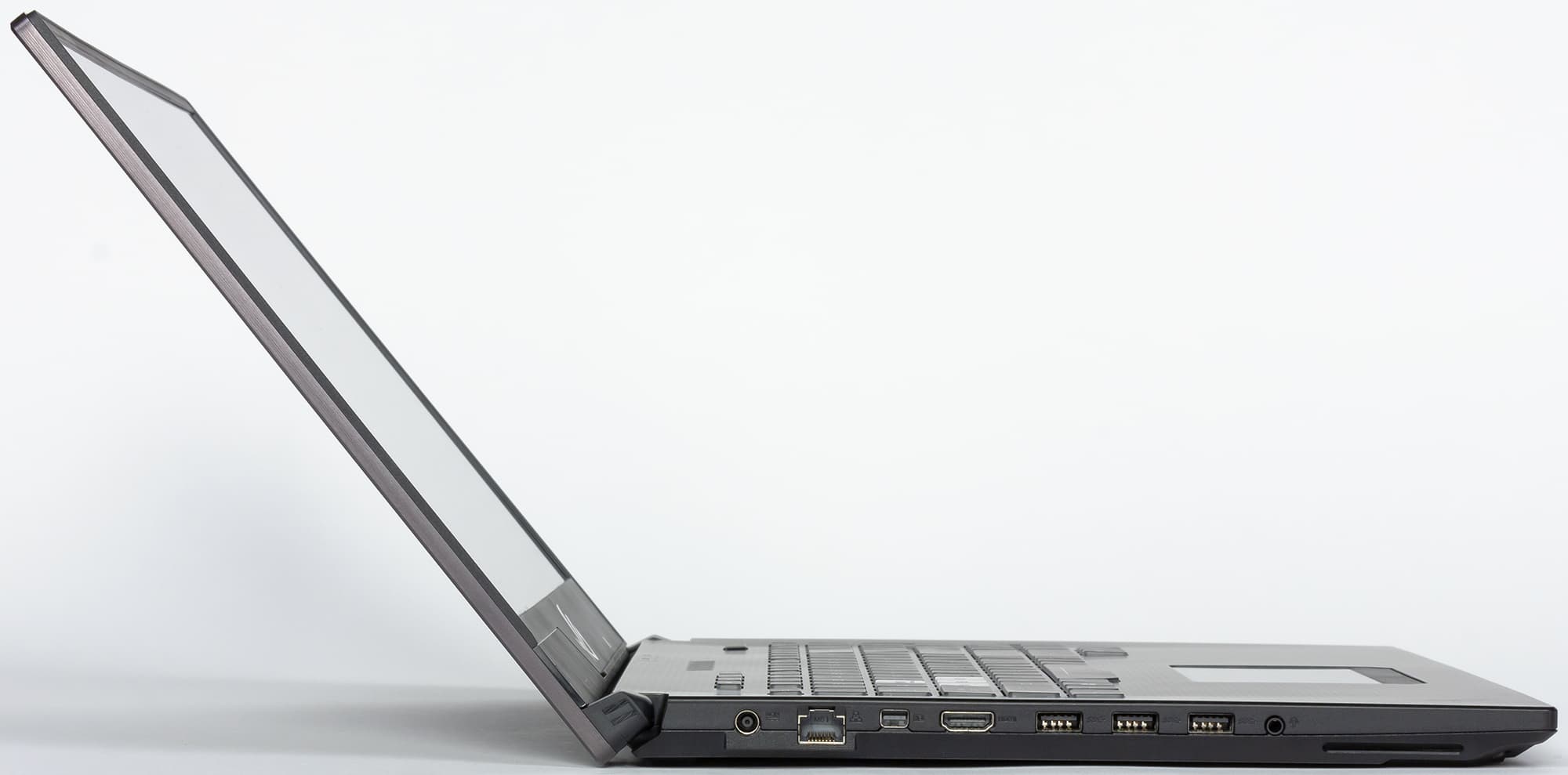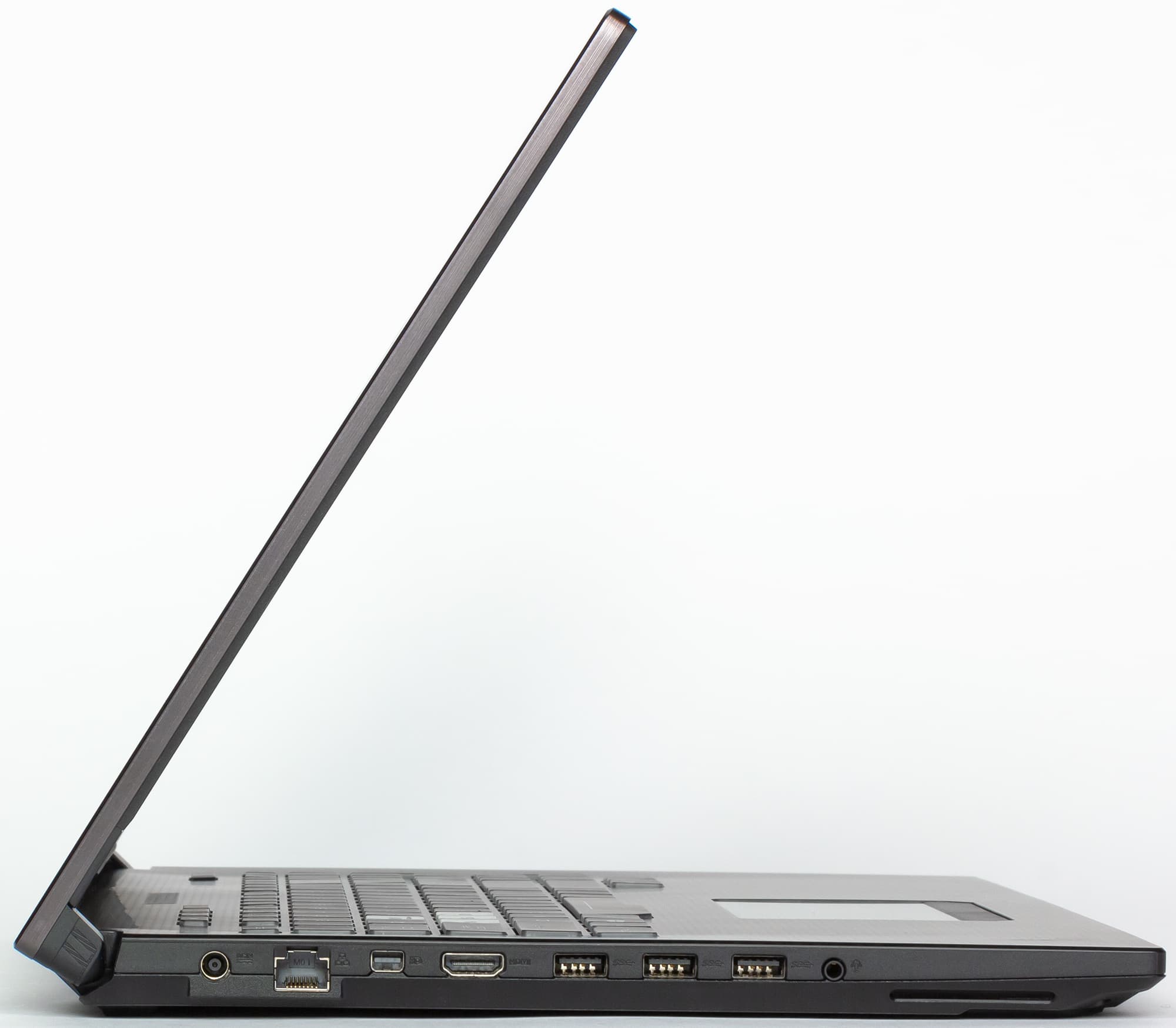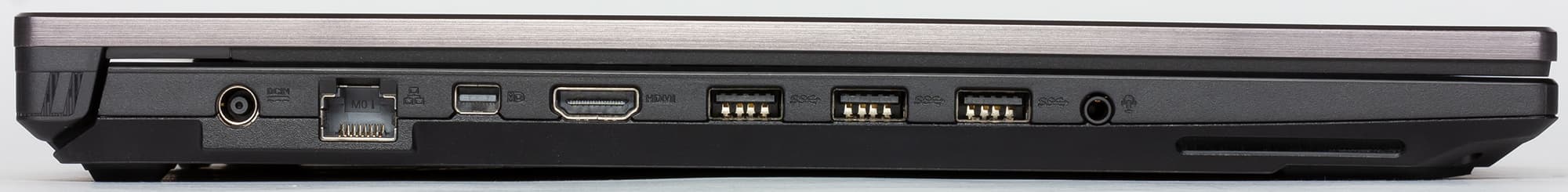 На левом торце корпуса расположены три порта USB 3.0 (Type-A), разъем HDMI, разъем Mini-DisplayPort, разъем RJ-45 и комбинированный аудиоразъем типа миниджек. Кроме того, тут же расположен разъем питания.