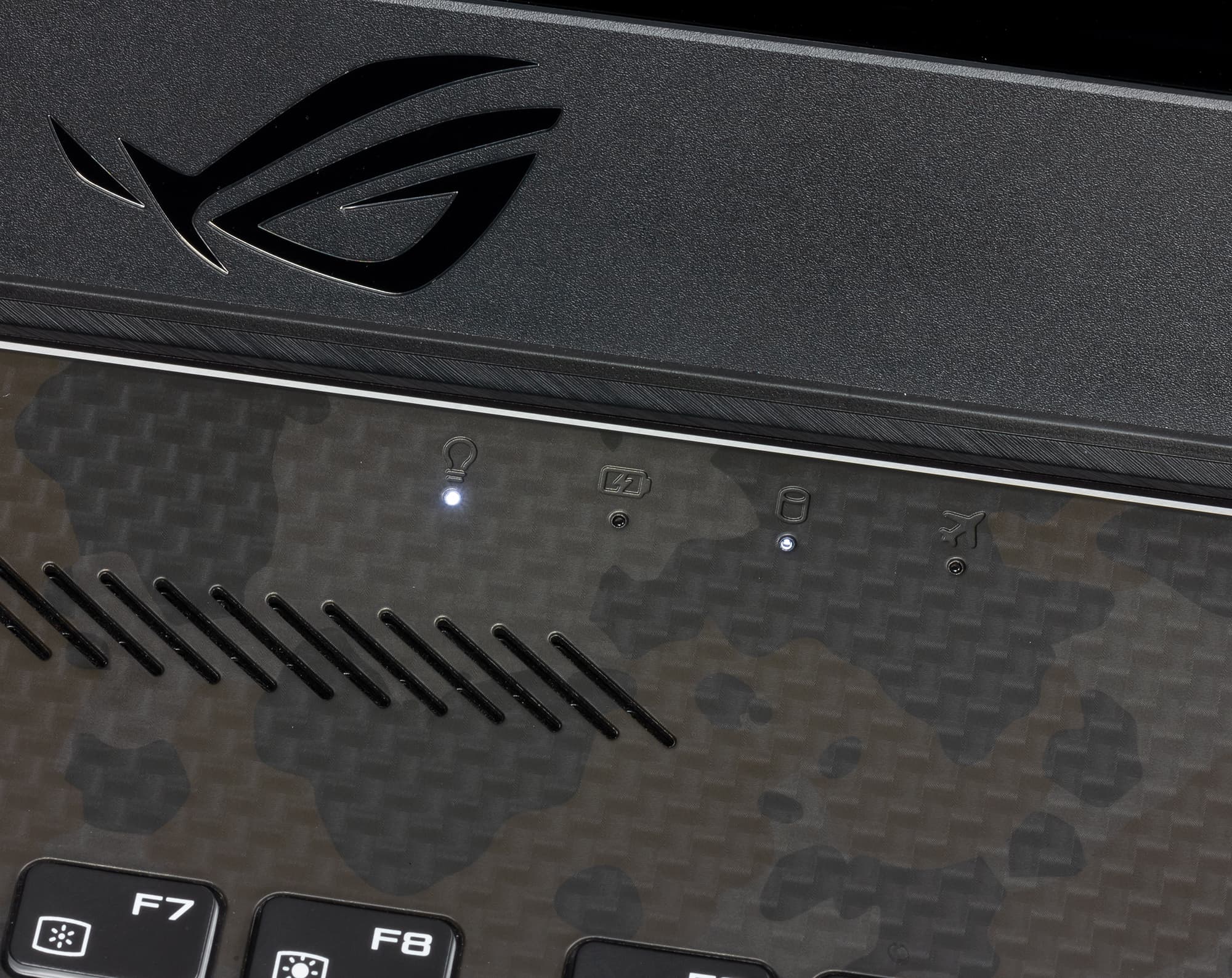 В левом углу рабочей поверхности, над клавиатурой, есть четыре отдельные клавиши управления ноутбуком: фирменная клавиша с эмблемой ROG, предназначенная для запуска приложения ROG Gaming Center, клавиша включения/отключения микрофона и две клавиши управления громкостью звука.