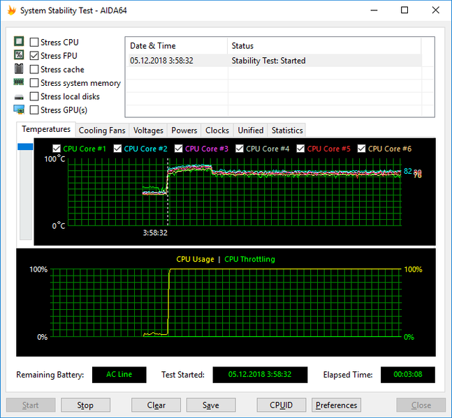 Температура ядер процессора стабилизируется на уровне 82 °C, а мощность энергопотребления процессора — 70 Вт.
