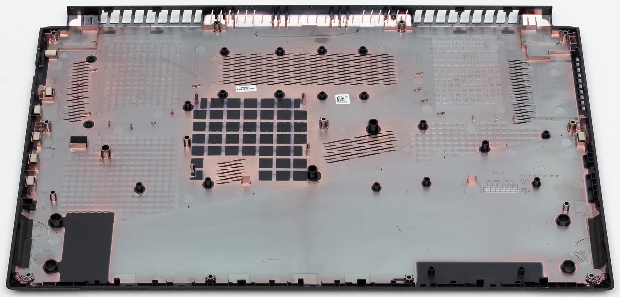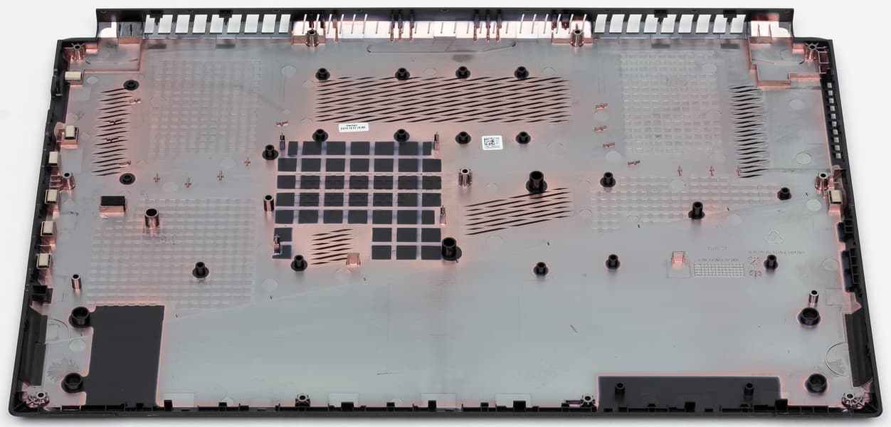На нижней панели корпуса, которая выполнена из черного пластика с рельефной отделкой, есть вентиляционные отверстия. Прорезиненные ножки обеспечивают устойчивое положение ноутбука на горизонтальной поверхности.