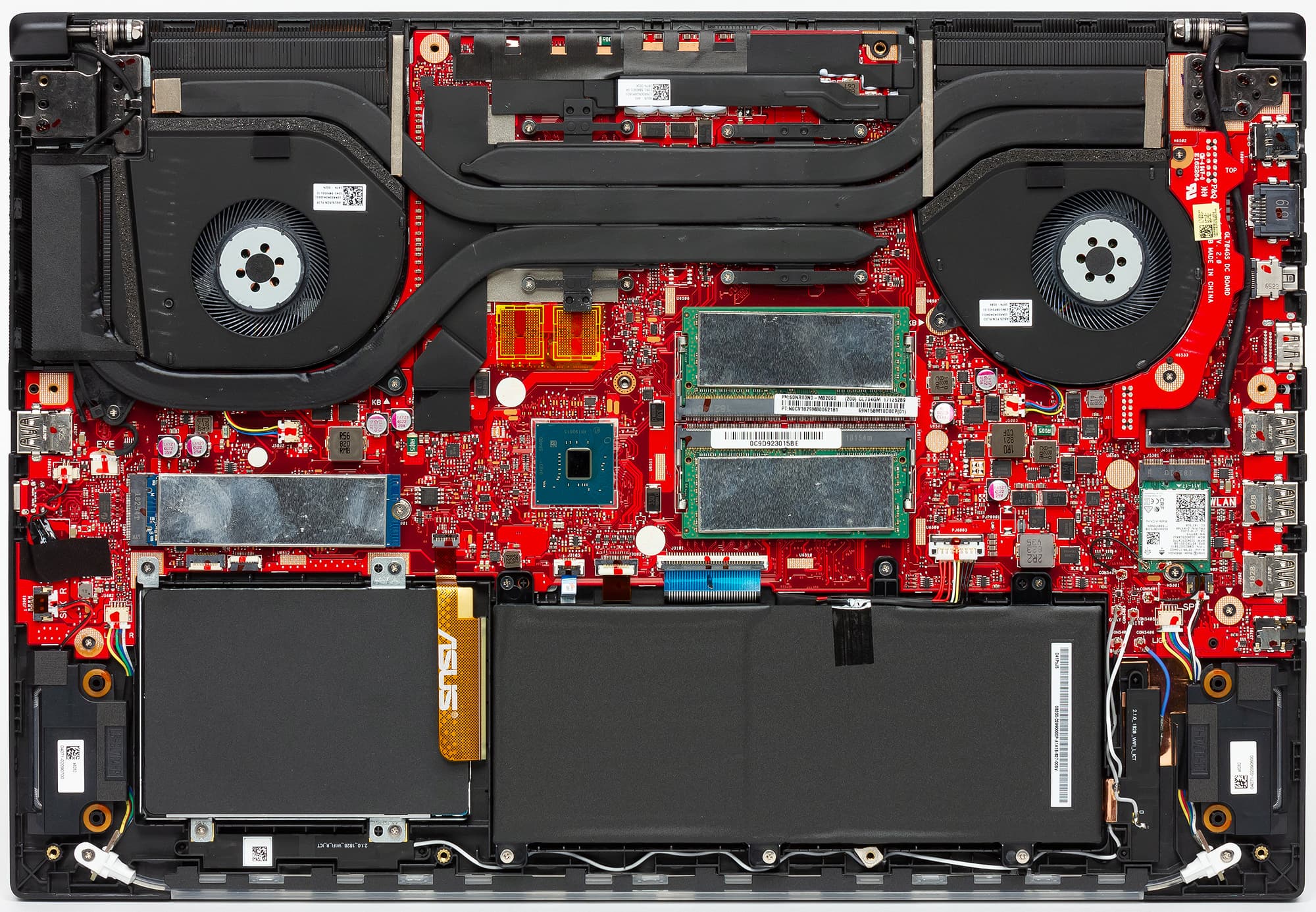 Сняв нижнюю панель корпуса Asus ROG Strix GL704GM Scar II, можно получить доступ практически ко всем компонентам ноутбука.