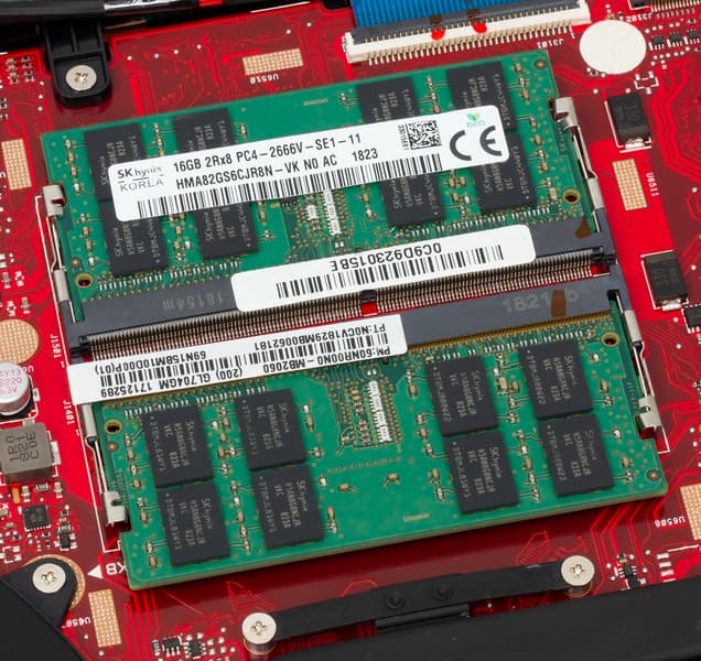 В нашем случае в ноутбуке было установлено два модуля памяти DDR4-2666 емкостью по 16 ГБ (SK Hynix). Максимальный объем памяти, поддерживаемый ноутбуком, составляет как раз 32 ГБ.