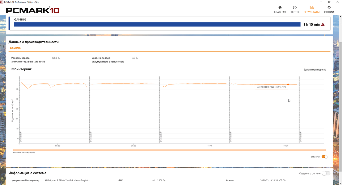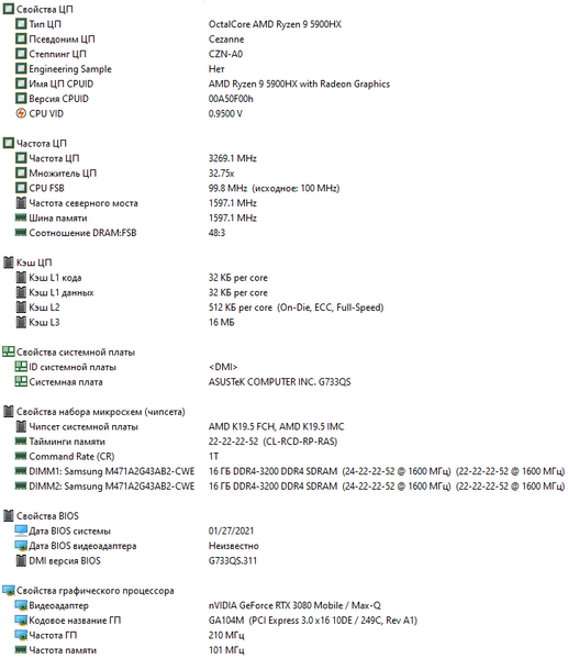 | Процессор | AMD Ryzen 9 5900HX (7 нм FinFET, 8 ядер/16 потоков, 3,3—4,6 ГГц, L3-кэш 16 МБ, TDP 35—54 Вт) | |